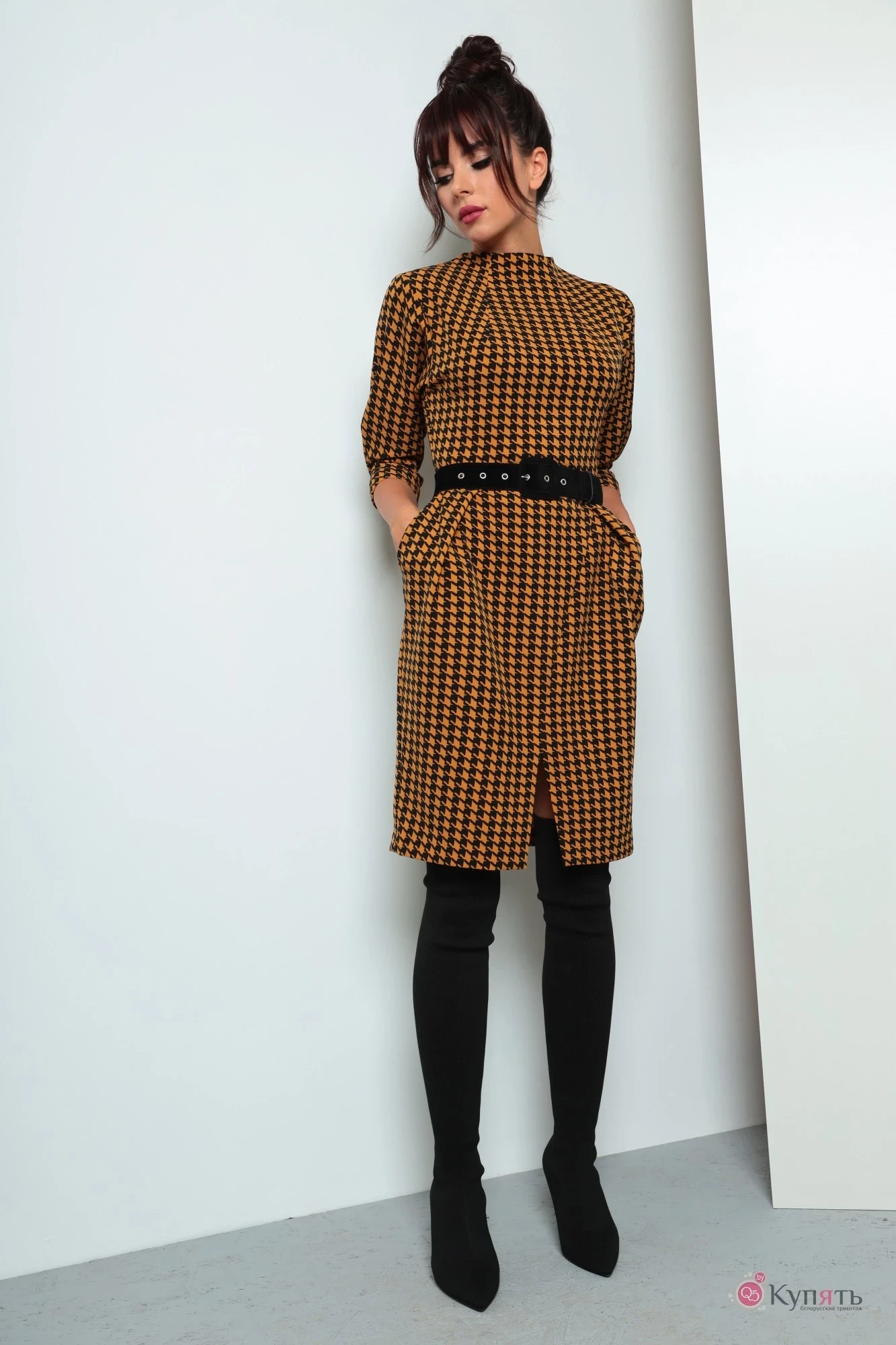 Роскошное платье премиум-класса. В этом платье Вы будете в центре внимания на любом торжестве. Модный силуэт. Чёткие линии подрезов. Шикарная посадка на фигуре подчёркивает женские формы и прекрасно формирует силуэт, придавая ему столь желанное сходство с песочными часами. Модель с втачным, полурегланым рукавом, длиной ¾ с защипом по нижнему краю. С потайной застёжкой молнией в среднем шве спинки. Горловина с цельнокроенной стойкой, обработана обтачкой. По полочке – фигурные вытачки к центру груди. Спинка с талевыми вытачками и вытачками по горловине. Длина платья от линии талии -59,5 см. Перед по линии талии со складками, придающими форму песочных часов. По переду нижней части платья- рельеф в виде запаха; разрез, длиной 16.5см. Боковые карманы. Платье без подкладки. Цвет платья может отличаться на полутон от заявленного на фото. Декоративный съёмный пояс подчёркивает изящество фигуры, может отличаться от заявленного на фото.