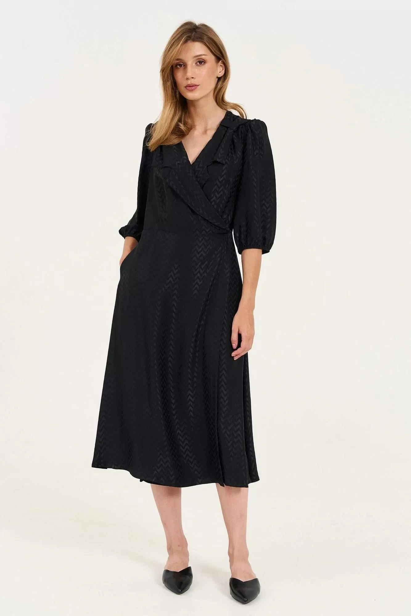 Платье лёгкое, струящееся на запахе. Отрезное по линии талии, расширенное к низу. Воротник выходящий из линии плеча, пиджачного типа, на участке воротника - декоративная перемычка создающая мягкую складку. Рукава одношевные с узкой резинкой по низу и сборкой по окату. Длина рукава до линии локтя. Застежка внешней части переда на потайную кнопку, внутренней части переда на завязку. В боковых швах карманы. Особенностью платья платья является обработка всех внутренних швов платья окантовкой, что придает изделию элитный вид.