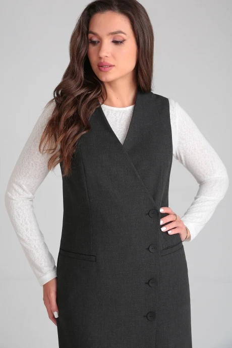 Платье на подкладке, полуприлегающего силуэта длиной ниже линии колена. По переду полурельеф из плечевого шва, прорезной карман с листочкой. Спинка с талиевыми вытачками. Вырез горловины V-образный. Застежка смещенная на петли и пуговицы и одну потайную кнопку.