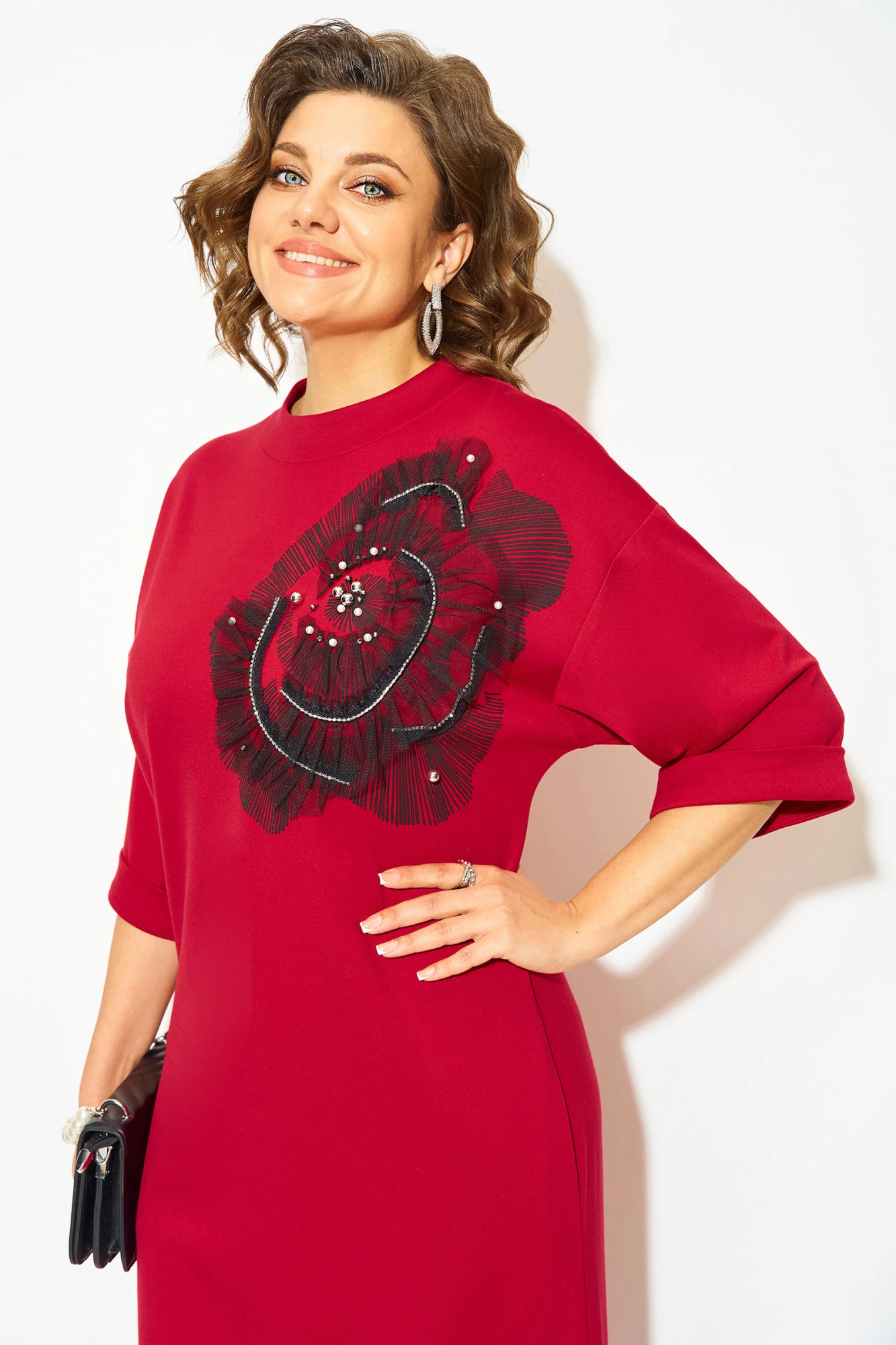 Очень лаконичное и стильное платье определённо привлечёт к себе внимание окружающих. Модель свободного «о»-образного силуэта. Левую часть плеча и груди украшает изысканная печать аппликация в виде цветка с декором из бусин и жемчуга. Платье с мягко лежащей стойкой у горловины. Рукав длиной ¾-ти, на притачной манжете на отворот. Модель слегка заужена к низу, с разно уровневым фигурным низом, оформленный обтачкой. В платье предусмотрены карманы.