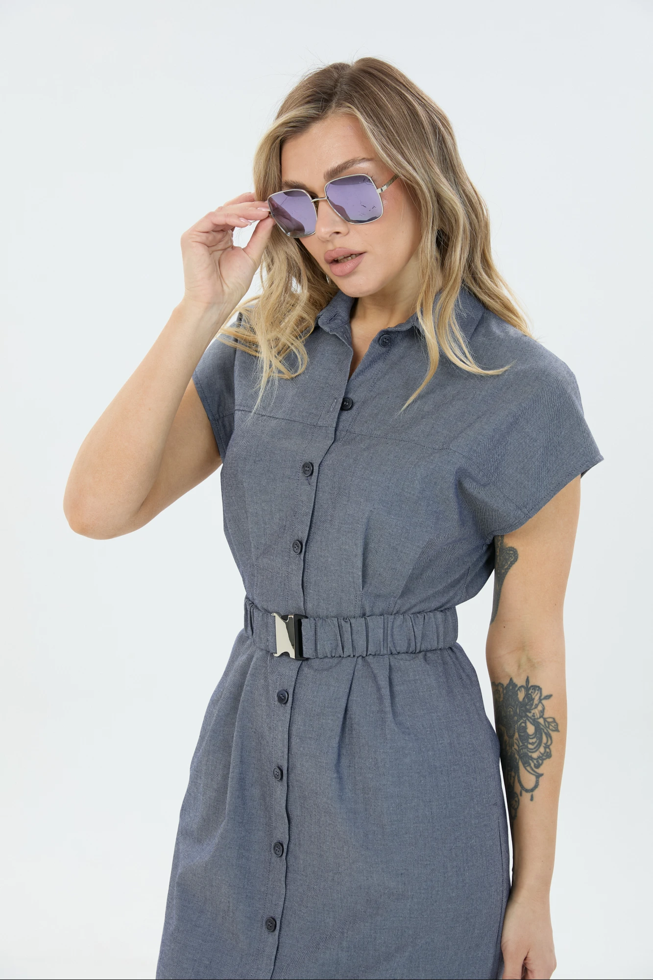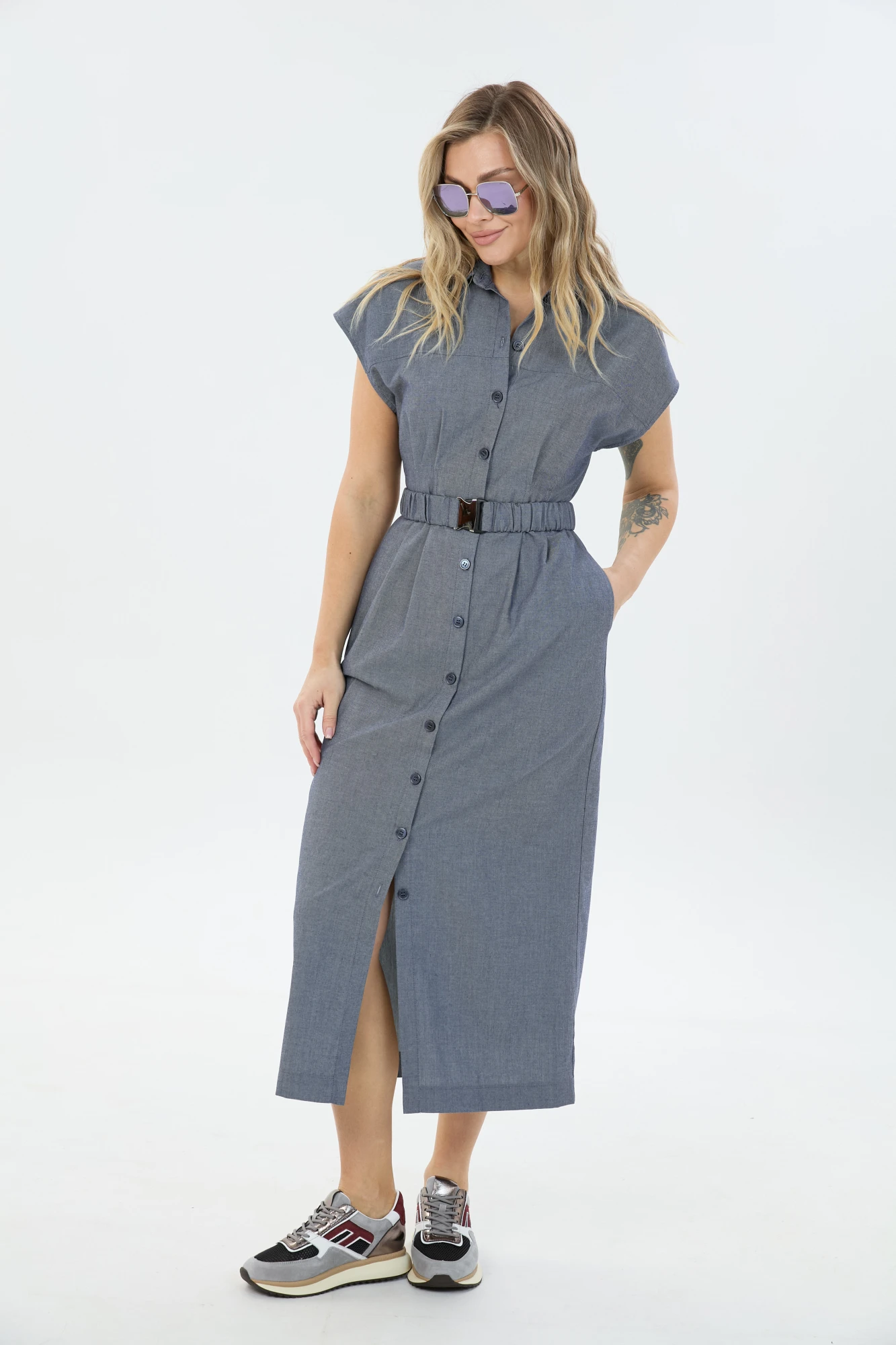 Платье умеренного объёма со спущенной линией плеча длиной ниже колена. Застёжка по переду на петли и пуговицы переходящая в разрез. Воротник отложной. По талии съёмный эластичный пояс.