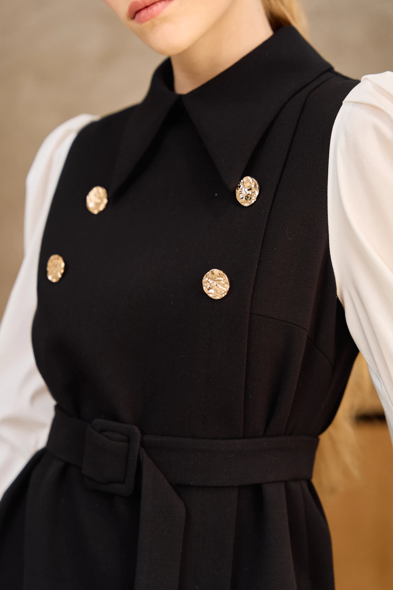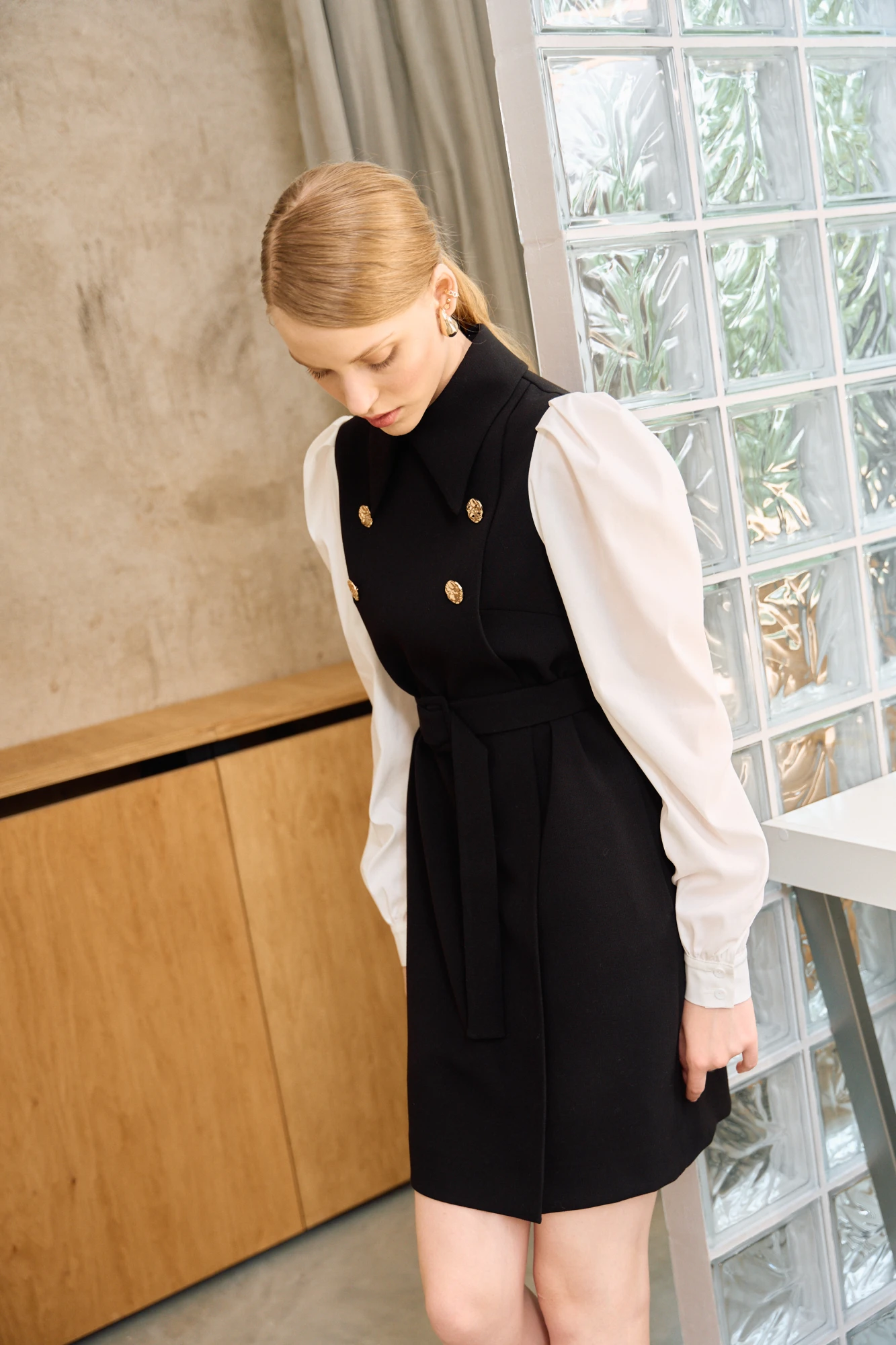 Платье полуприлегающего силуэта, выполнено из костюмной ткани. Рукав втачной длинный, выполнен из хлопка. По верхней и нижней части рукава сборка, по низу рукава манжета на застежку на петли и пуговицы. По горловине воротник рубашечного кроя. По левой стороне складка имитирующая запах. Выше линии груди пришиты металлические пуговицы. По спинке средний шов переходящий в застежку на потайную молнию.