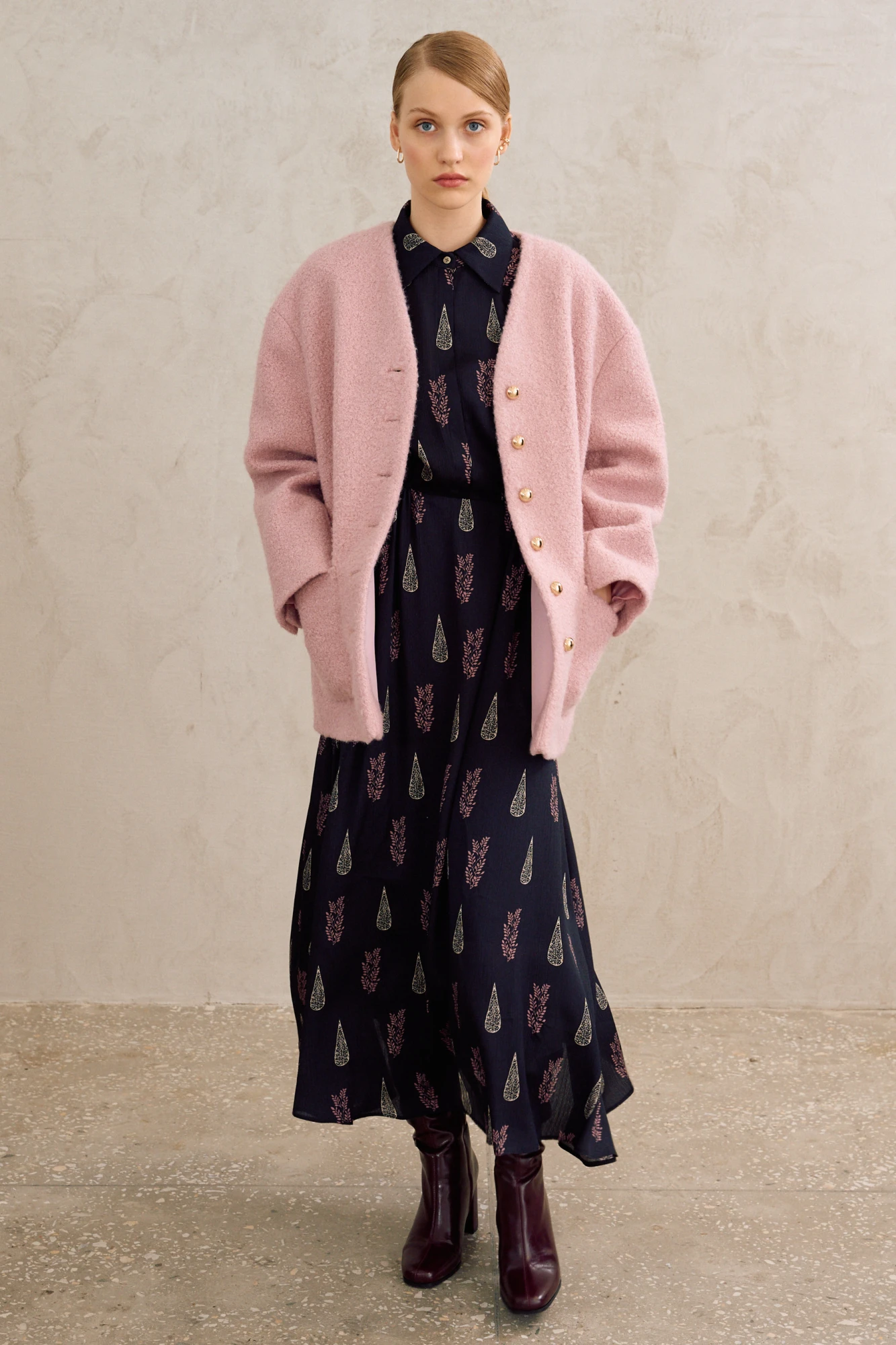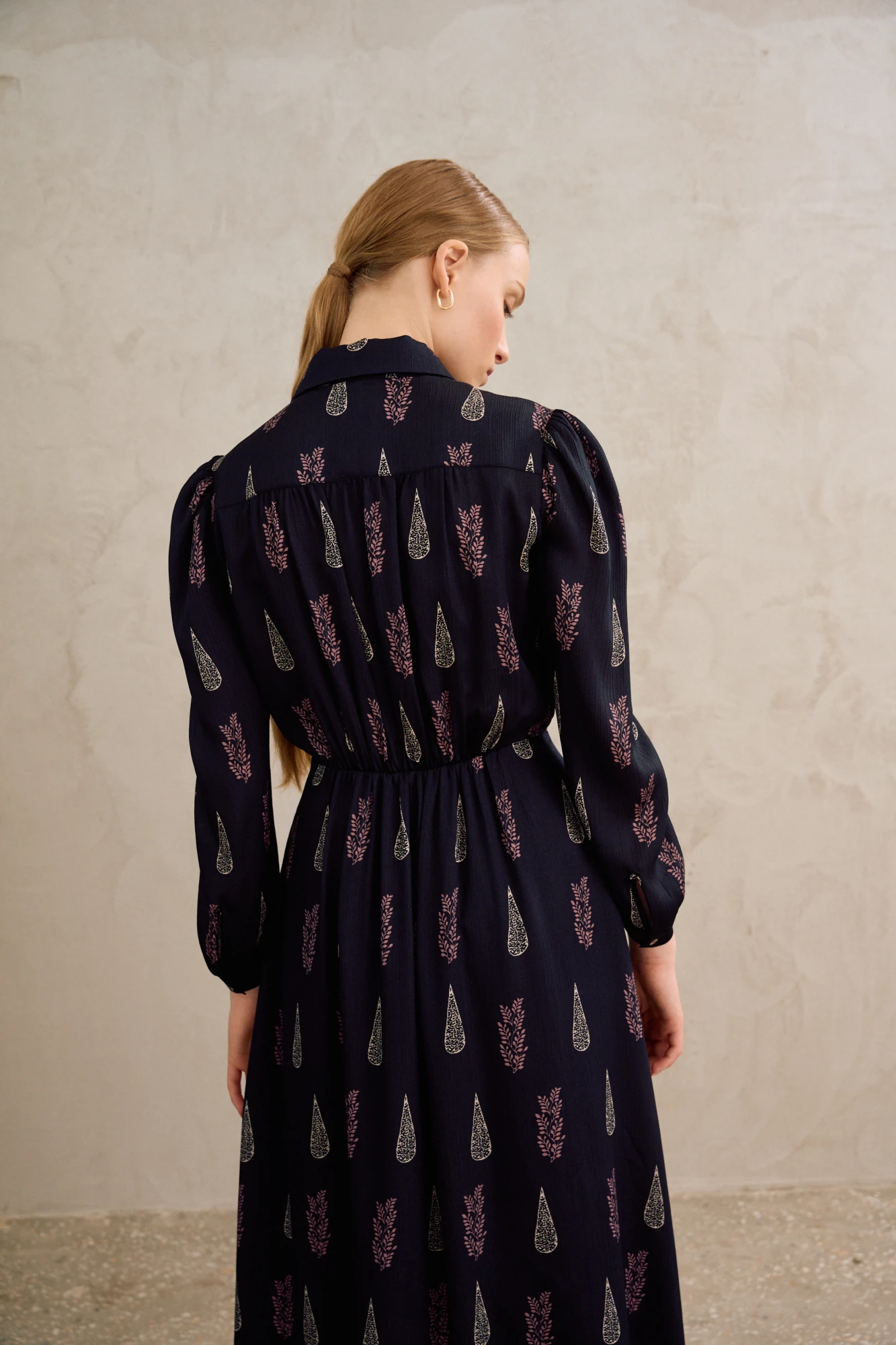 Платье полуприлегающего силуэта, отрезное по талии. Рукав втачной, по низу рукава манжета с застежкой на петли и пуговицы. Воротник рубашечного кроя, по переду