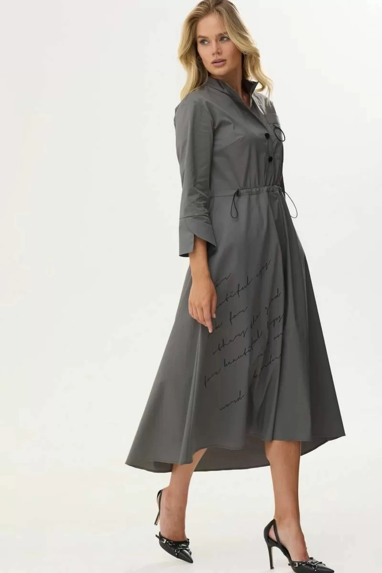 Стильное платье полуприлегающего силуэта из хлопковой ткани. Горловина-стойка с застежкой на петли и пуговицы. Рукав со спущенной линей плеча, по низу манжета. Перед и спинка отрезные по линии талии. В подрез вставлен декоративный шнур, благодаря чему можно регулировать степень прилегания. По переду обработан накладной карман с декоративным кольцом. На планке и по юбке предусмотрена дизайнерская печать. В боковых швах карманы. Обращаем ваше внимание, что фурнитура может незначительно отличаться от фото. Рост модели 178 см.