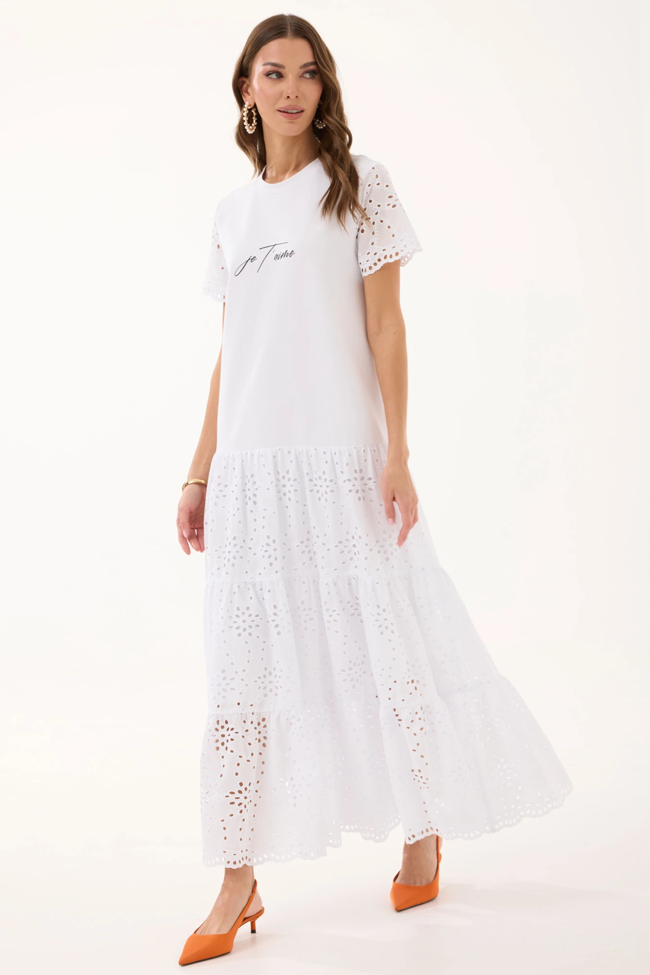 Свободное платье А-силуэта, скомбинированное из ришелье и трикотажа. По переду платья расположена дизайнерская печать. Рукав втачной, горловина округлая. От линии бедер по переду и спинке подрезы на сборке. Юбка в платье с хлопковой подкладкой.