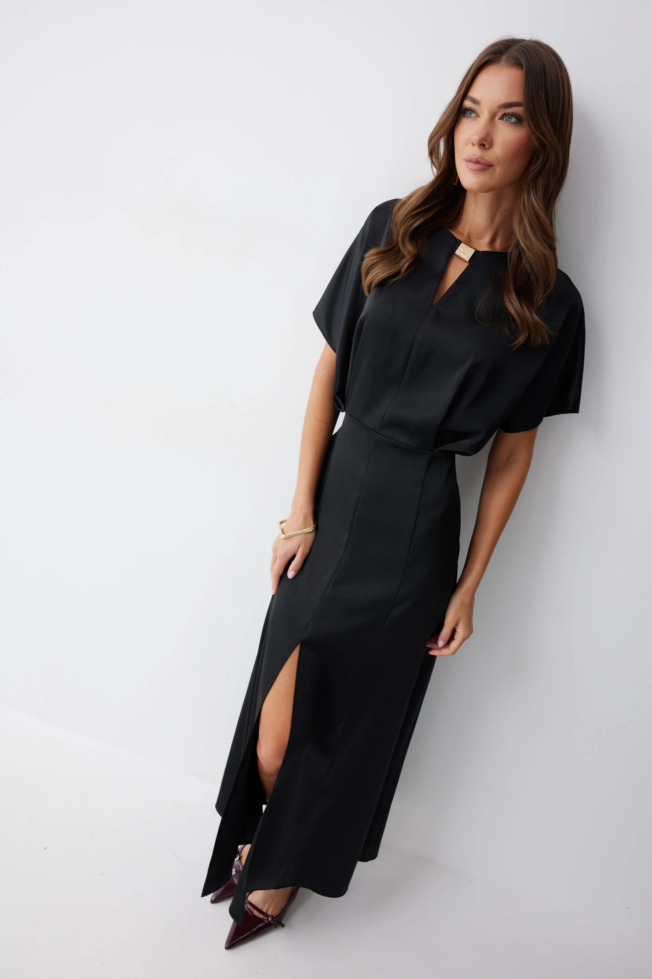 Нарядное платье из струящейся ткани длины макси. Рукав цельнокроеный. Платье отрезное по линии талии, на полочке заложены складки. Горловина округлая, с декоративно протяжкой по центру. По спинке средний шов с застежкой на потайную молнию. Юбка расширенна книзу от бедра. Обращаем ваше внимание, что фурнитура может незначительно отличаться от фото.