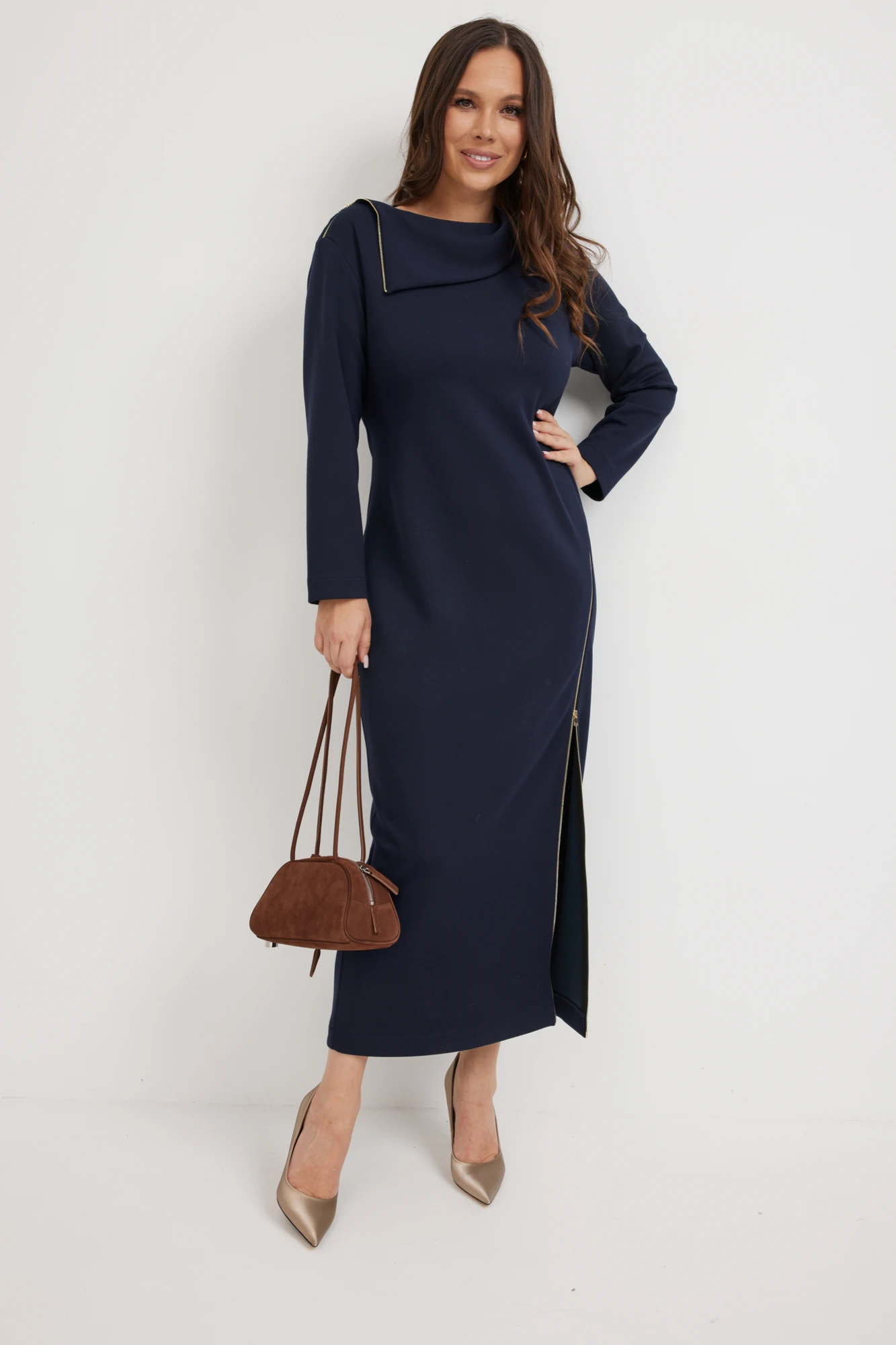 Элегантное и стильное платье миди полуприлегающего силуэта. Выполнено из приятного к телу комфортного гладкого трикотажного полотна. Рукав втачной, полной длины. Украшением платья являются функциональные тесьмы молнии. С их помощью можно стильно уложить воротник и отрегулировать вырез платья. Из лаконичного базового платье легко трансформируется в стильное и сексуальное. Длина платья от плечевого шва 127см. Длина рукава 60см.