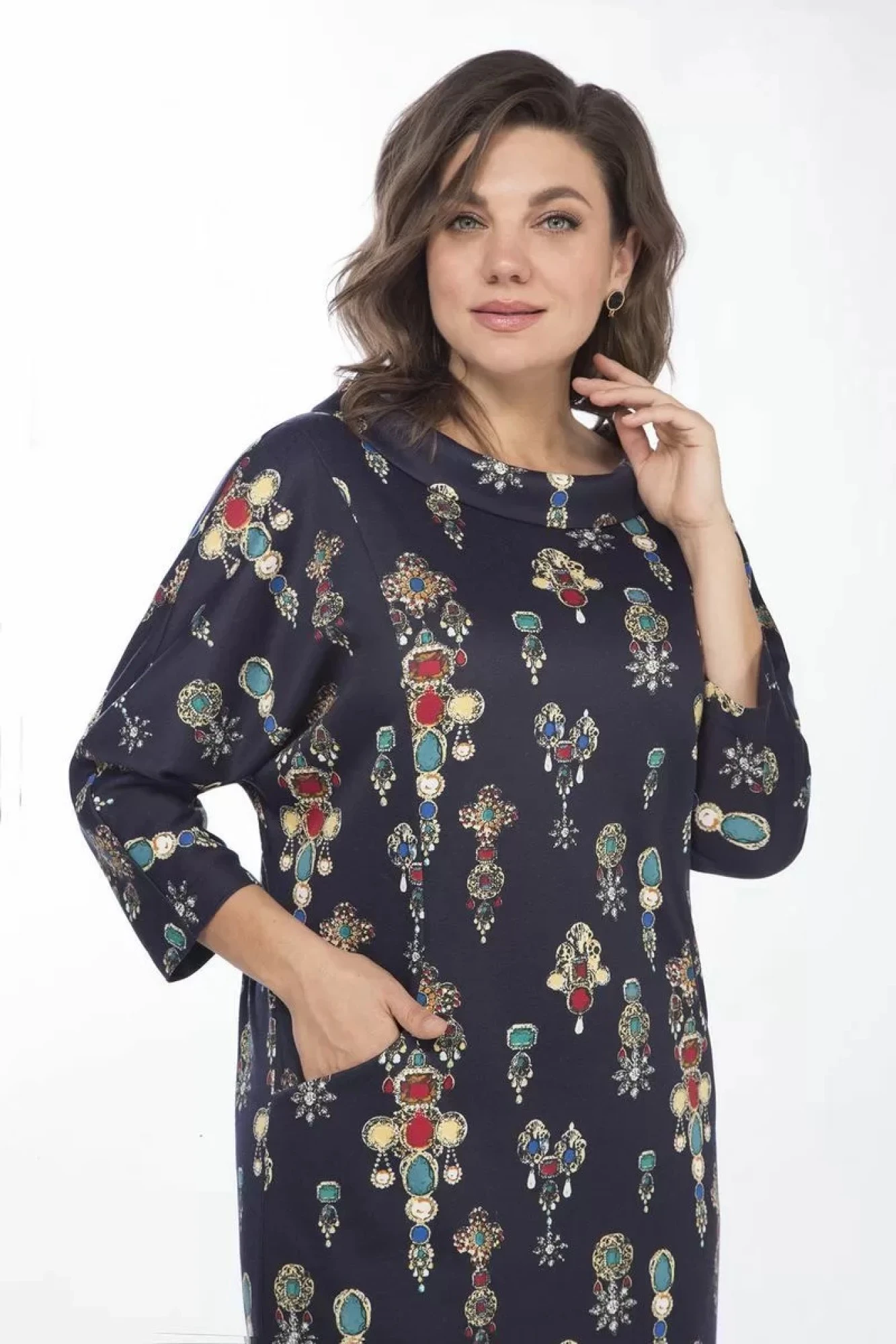 Платье женское прямого силуэта из трикотажной ткани. По переду выполнены рельефы с карманами. Рукав цельнокроеный,воротник отложной
