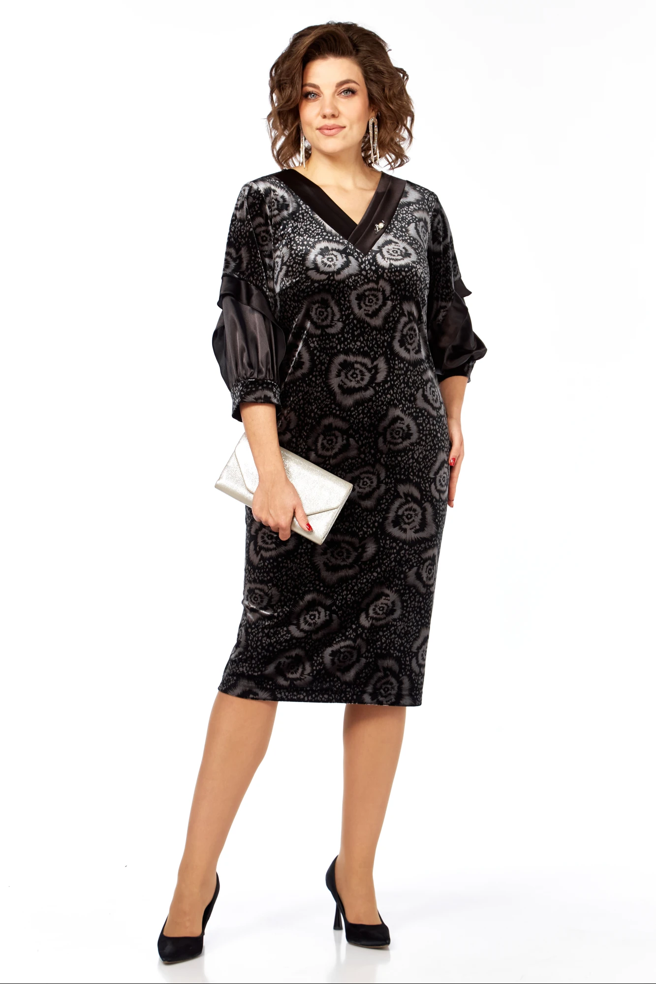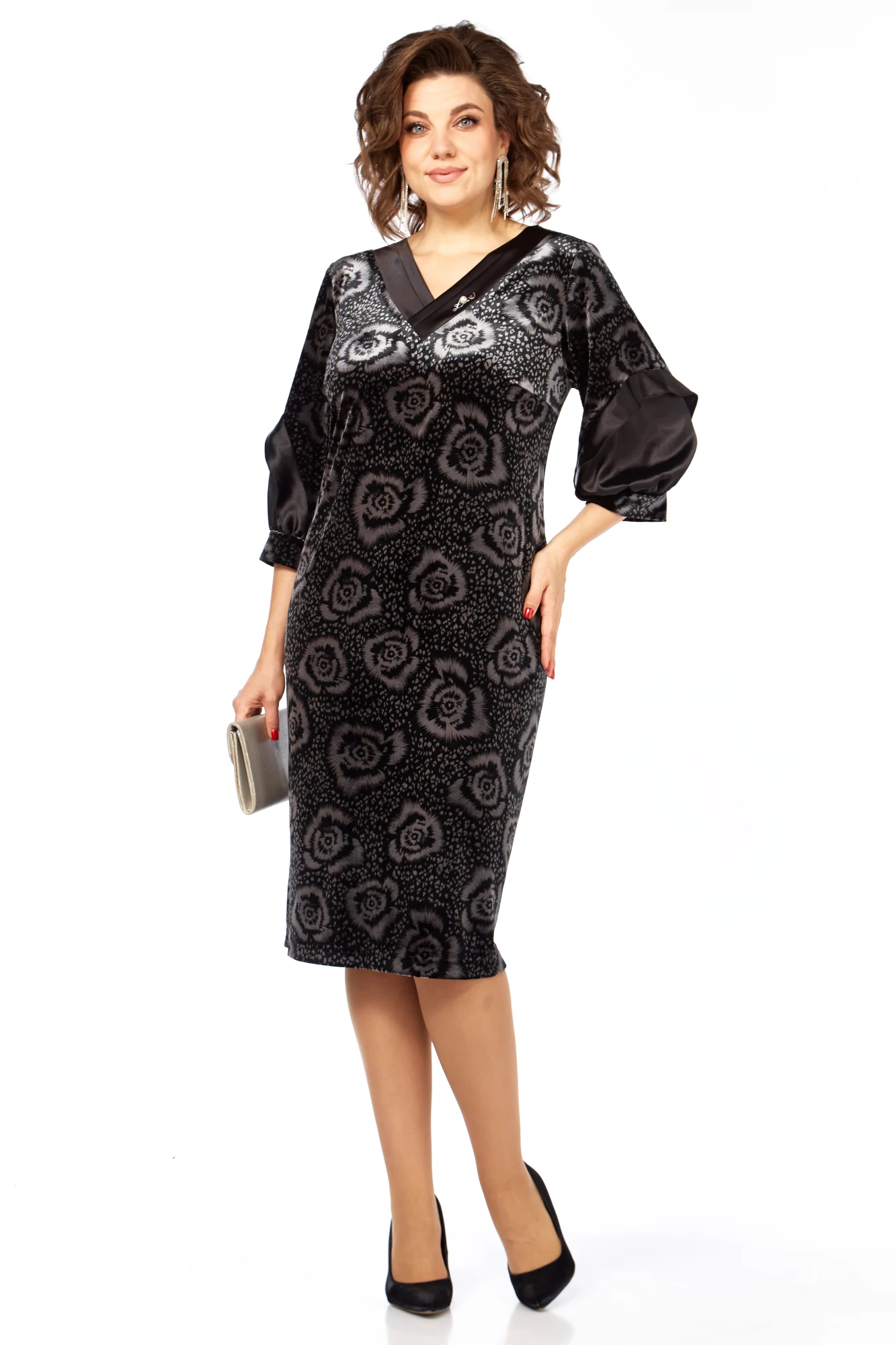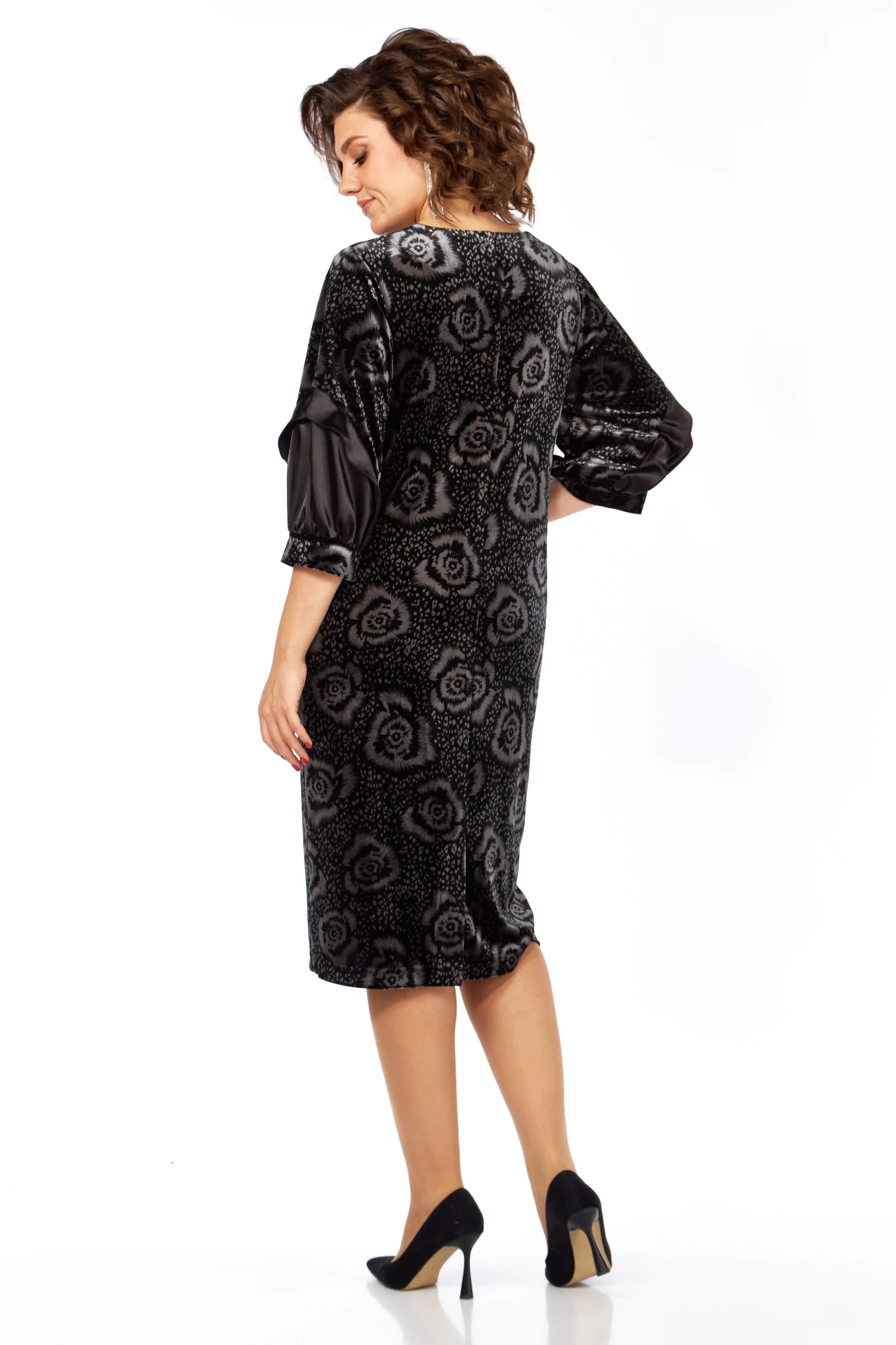 Платье женское прямого силуэта, из бархатного полотна с отделкой из однотона. Перед платья с нагрудными вытачками из боковых швов, V-образным вырезом горловины, обработанным декоративными планками из отделочной ткани, на планки нашит декоративный элемент. Спинка со средним швом и шлицей на движение в нем. Рукав втачной одношовный, на манжете, с отрезной деталью по низу и декоративной рюшей.