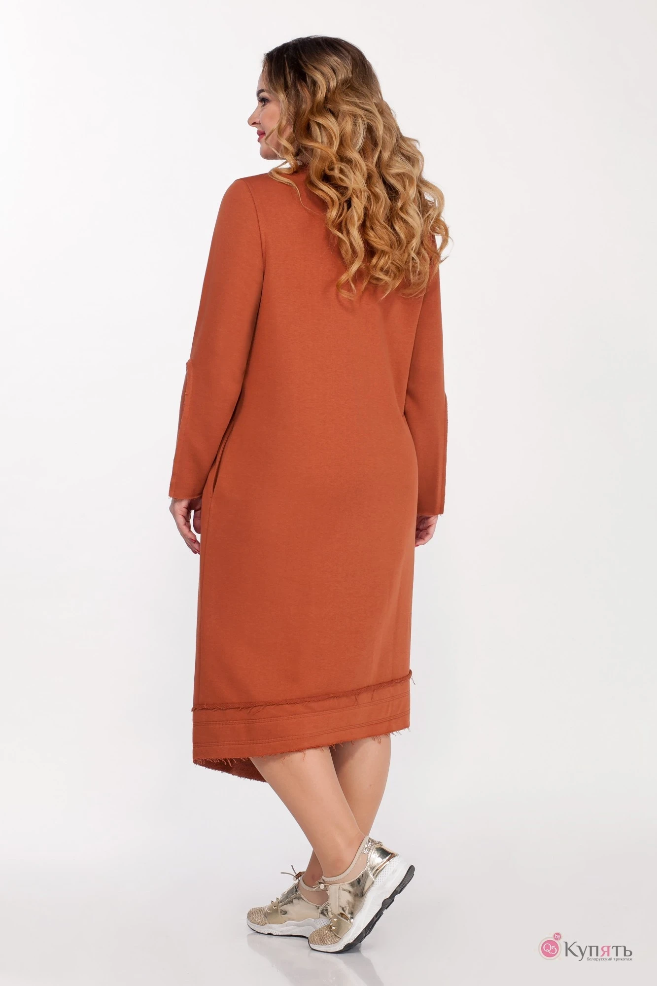 Получила платье 58 размера. Плотное тяжёлое, на прохладное время года. По плечам мне село отлично, но не скрывает живота. Поэтому учтите при заказе - оно практически прямое. Цвет терракотовый приятный и само очень милое.