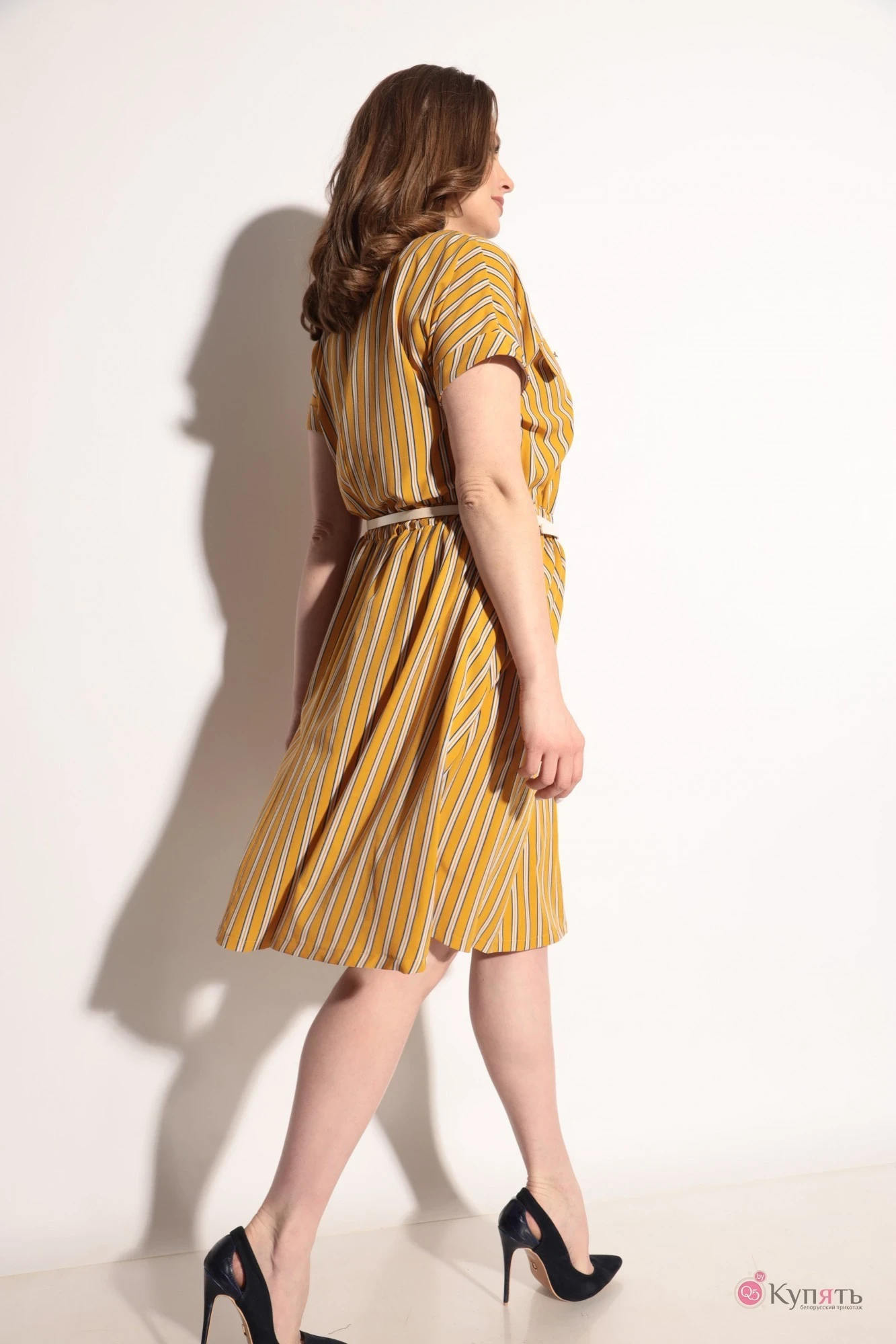 Струящееся платье с расклешенной к низу юбкой, выполнено из облегченной ткани очень приятной к телу, в боковых швах карманы. Рукав цельнокроеный приспущенный на отложенной манжете. Настрочные клапаны по лифу платья имитируют вход в карман и украшают, но абсолютно не утяжеляют изделие. По поясу вставлена резинка, фиксирующая высоту талии и подчеркивающая ее. Ремешок идет в комплекте.