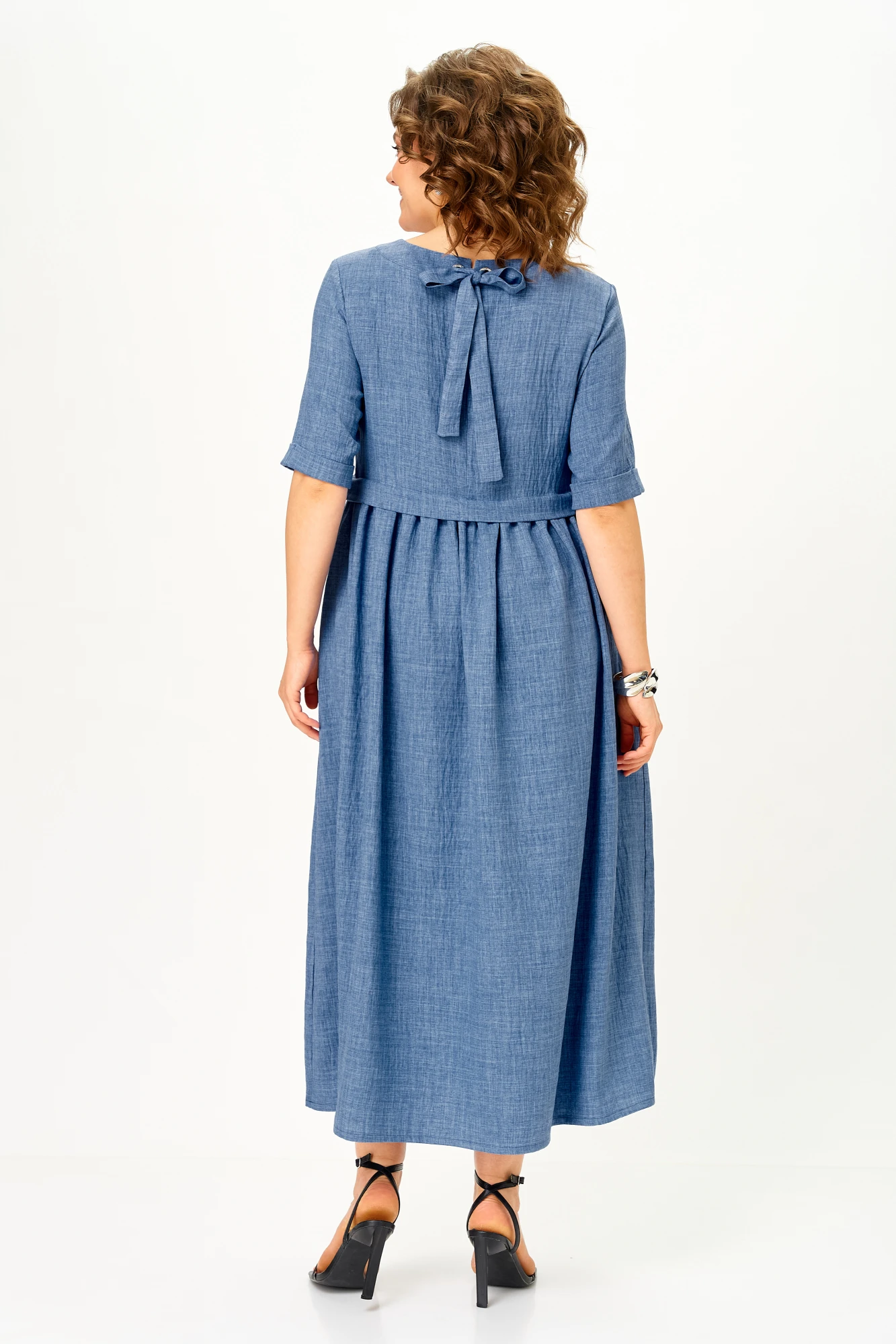 Актуальное длинное платье оригинального кроя — отличное решение для будней и для торжеств. Платье выполнено из летящей ткани «лен-вишер», которая напоминает по своей структуре натуральный лен. По переду изделие украшено декоративными завязками с пуговицами. Верх изделия с завышенной талией, округлой горловиной и втачным рукавом 3/4. Верх горловины на спинке украшен декоративной завязкой. Низ платья свободного кроя с боковыми карманами, по талии сборка