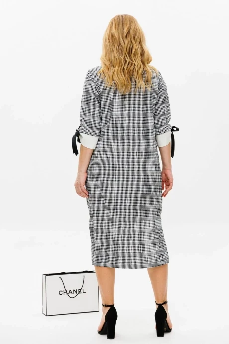 Универсальное платье из легкой плательной ткани крэш в мелкую клетку. Данное платье может быть как нарядным, так и для повседневной носки. Изделие свободного кроя, рукав втачной длиной 3/4, который фиксируется декоративными лентами, с контрастной отделкой по краю. Воротник апаш с декоративной лентой. По переду платья функциональный накладной карман. Спинка прямая удлиненная, по бокам разрезы. Изделие может сочетаться как с лоферами, так и с туфлями и босоножками. Универсальность и практичность платья сделают его любимым в Вашем гардеробе