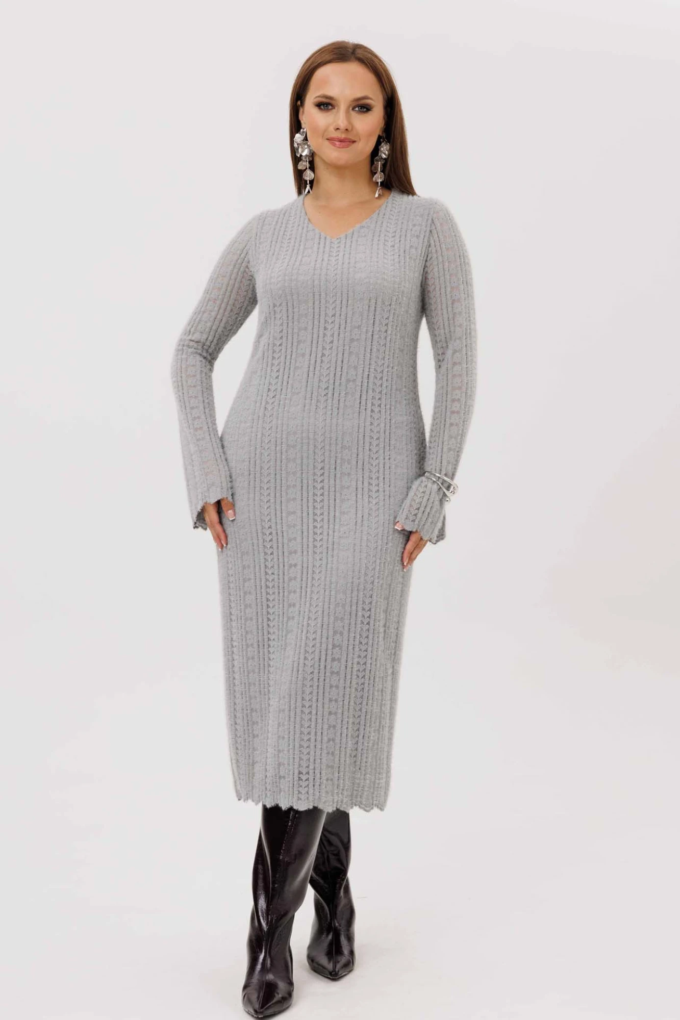 Платье трикотажное на подкладке. Платье выполнено из трикотажного полотна с ажурным (кружевным) рисунком. Полотно средней плотности, эластичное, с мягким прилеганием по фигуре. Изделие полуприлегающего силуэта, длиной миди, с V-образным вырезом горловины и длинным втачным рукавом. Низ рукавов и низа изделия обработан фигурным краем полотна, что придаёт модели завершённый декоративный акцент. Для комфортной посадки предусмотрена трикотажная подкладка по всей длине изделия.