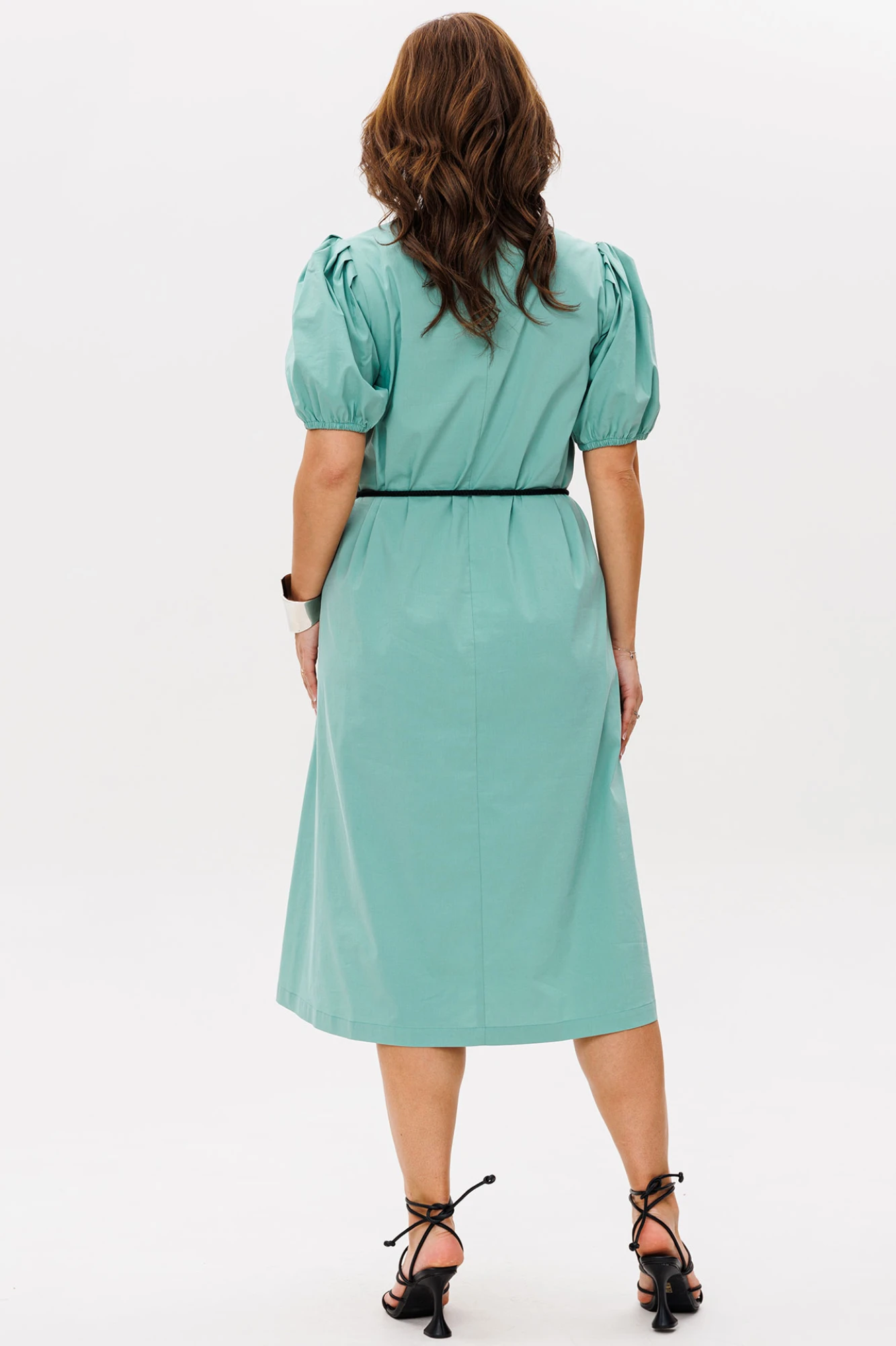 Платье женское А-силуэта выполнено из летнего хлопка содержащей плательной ткани. По переду нагрудные вытачки. Горловина V-образная, украшена контрастным кружевом. Спинка с центральным швом. В боковых швах карманы. Рукава одно шовные втачные со складками по окату и сборкой на резинку по низу. Платье без подкладки. Дополнением служит пояс-шнур.