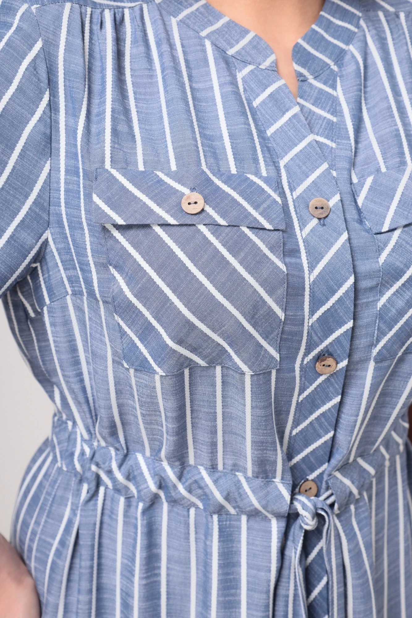 Платье женское прямого силуэта, без подкладки, центральная застежка ввиде планки застегивается на петли и пуговицы. На переде обработана планка, под кокеткой сборка, нагрудные вытачки, на уровне груди настрочены накладные карманы с клапанами, застегиваются на пуговицу. Кокетка спинки от проймы, переходит на перед, спинка без вытачек, по центру спинки под кокеткой сборка. По линии талии настрочена кулиса, со стороны переда втянут пояс завязывающейся до бокового шва, по спинке кулиса присобрана на эластичную тесьму. Горловина обработана двойной бейкой. Рукав одношовный, втачной.