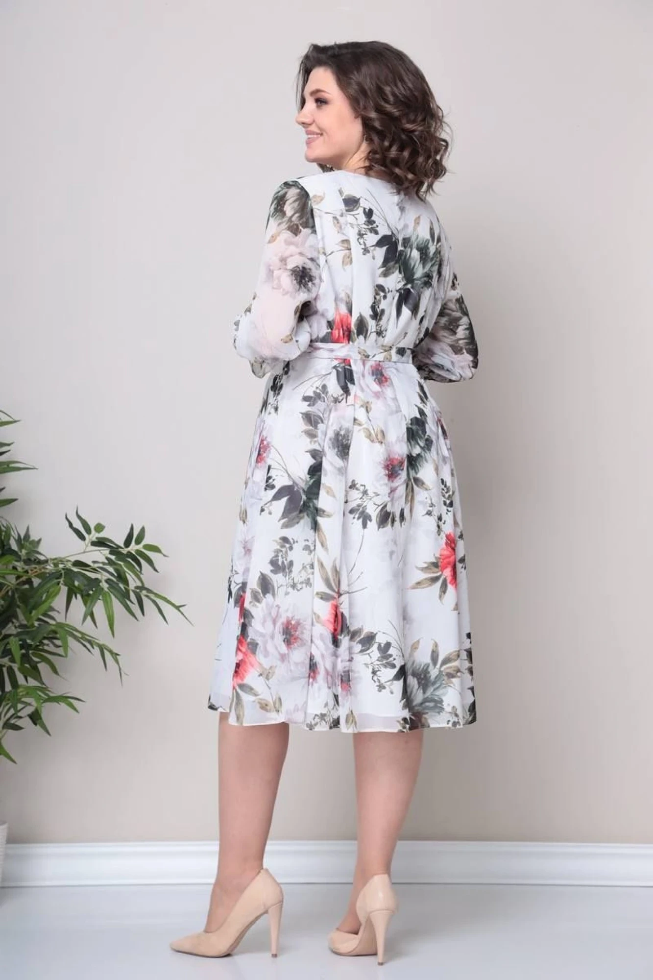 Платье женское отрезное, верхняя часть полуприлегающая, нижняя часть расклешенная, на подкладке, тесьма-молния в левом боковом шве. Перед и спинка отрезные по линии талии. Верхняя часть переда с нагрудными и талиевыми вытачками. Верхняя часть спинки с талиевыми вытачками. Нижняя часть расклешенная. Горловина обработана обтачкой. Рукав одношовный, втачной, свободный, с притачной манжетой, присобрана на эластичную тесьму в несколько рядов.