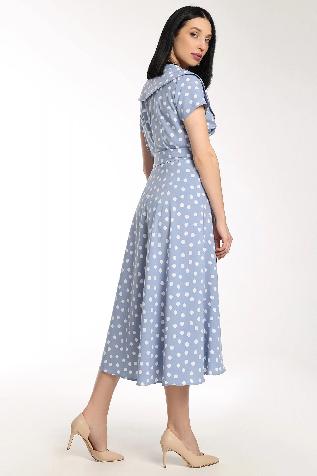 Элегантное и женственное платье приталенного силуэта, отрезное по талии, расширенное к низу, со смещенной застежкой на 4 пуговицы. По переду талиевые и нагрудные вытачки. Спинка со средним швом и талиевыми вытачками. Воротник отрезной, шалевый. Рукав втачной, одношовный. Застежка-молния в боковом шве. Платье дополнено широким поясом с декоративной пряжкой.