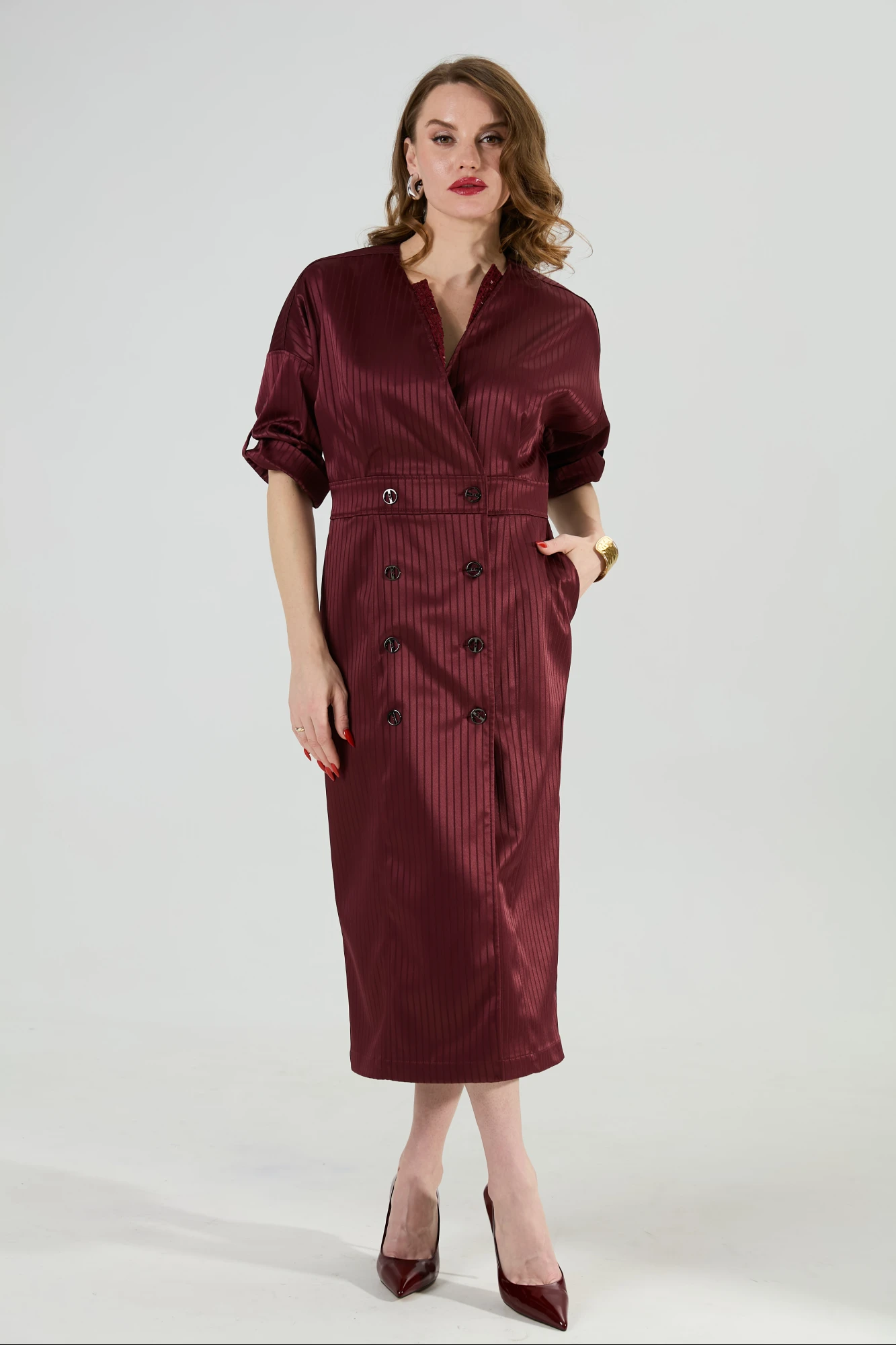 Эффектное двубортное платье длиной миди полуприлегающего силуэта. Линия плеча приспущена, рукав втачной три четверти с манжетой и патой. Горловина обработана обтачкой с V-образным вырезом, декорирована пайетками. Линия талии акцентирована притачным поясом. Имеются карманы в боковых швах. Изделие застёгивается на пуговицы. Без подкладки.