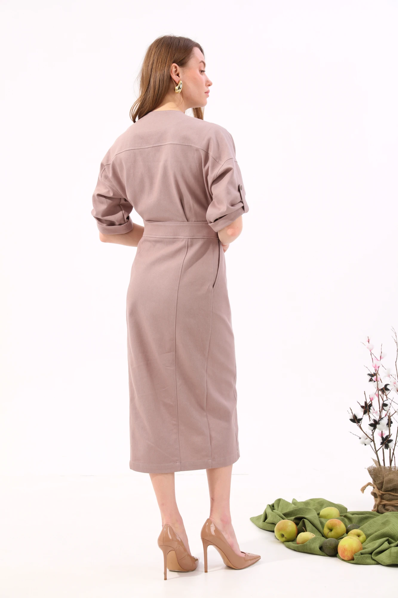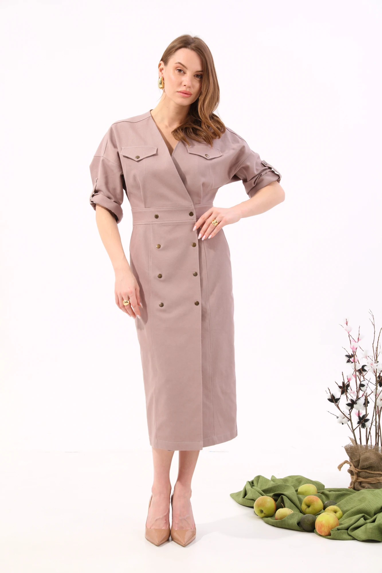 Эффектное двубортное платье длиной миди из денима полуприлегающего силуэта. Линия плеча приспущена, рукав втачной три четверти с манжетой и патой. Горловина обработана обтачкой с V-образным вырезом. Линия талии акцентирована притачным поясом. Имеются карманы в боковых швах. Изделие застёгивается на кнопки. Без подкладки.