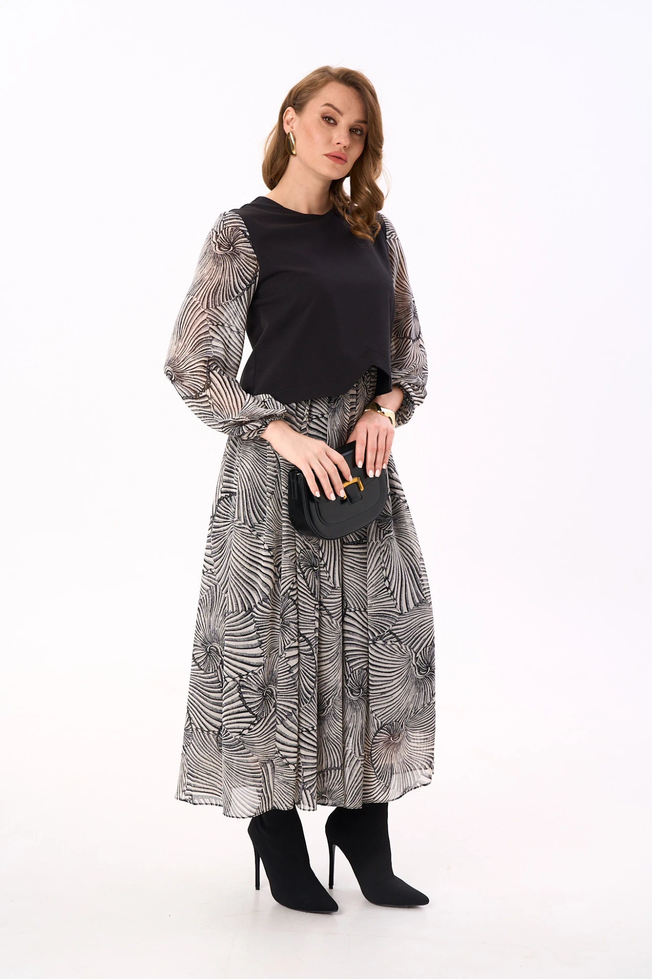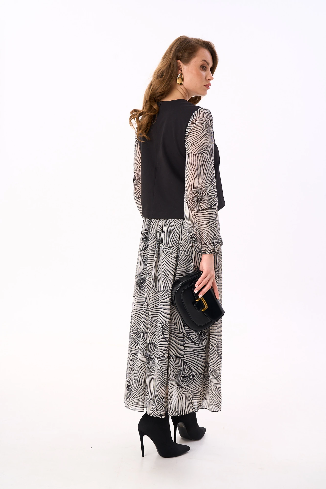 Платье макси комбинированное, двухцветное. Лиф фигурный. Вырез горловины полукруглый, по спинке затежка на молнию. Рукава втачные, собраны на резинку. Юбка на резинке, драпирующаяся, расширенного силуэта.