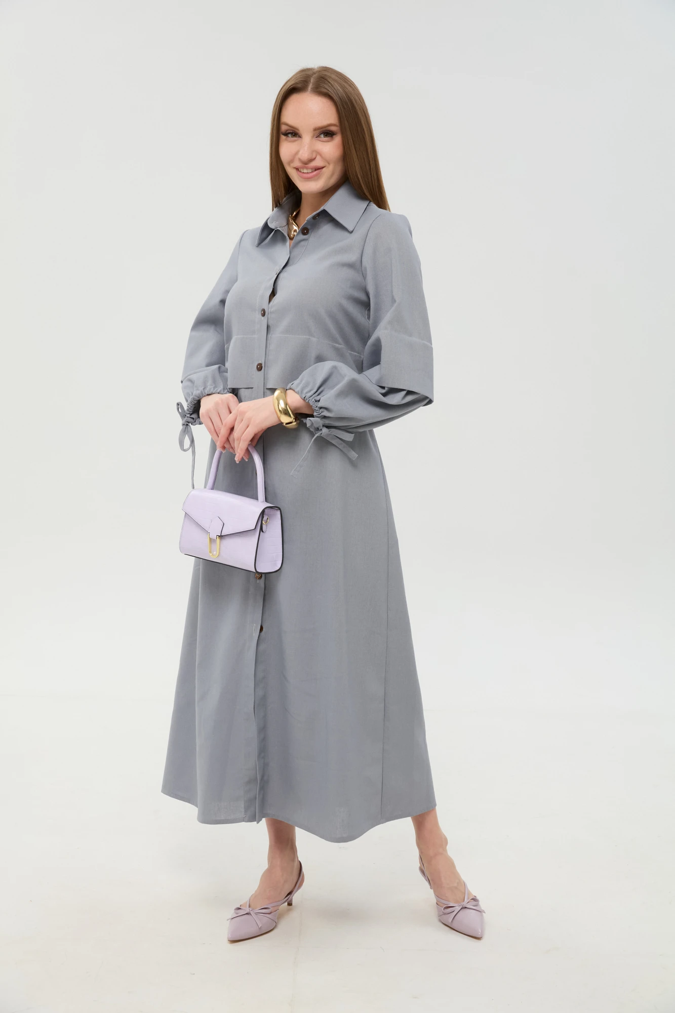 Платье макси с центральной отрезной застёжкой на потайную планку на петли и пуговицы.По переду и спинке цельнокроеные складки на уровне талии. Рукав втачной,одношовный рубашечноно типа. По низу рукава пробиты петли и вставлена завязка для фиксации сборки . Воротник рубашечный стояче отложной. В комплект к изделию идёт пояс из основной ткани для максимально комфортного регулирования объёма.