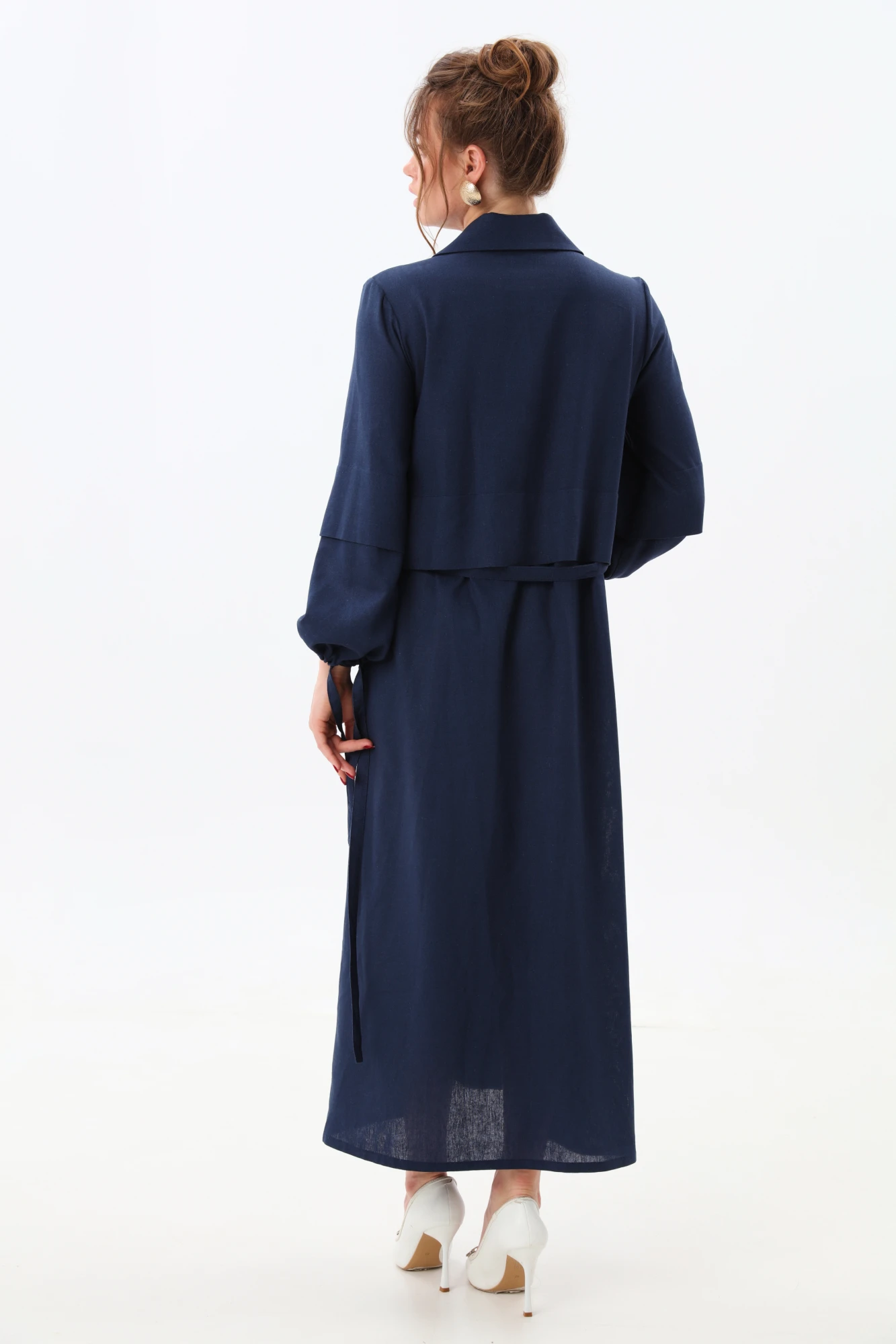 Платье макси с центральной отрезной застёжкой на потайную планку на петли и пуговицы.По переду и спинке цельнокроеные складки на уровне талии. Рукав втачной,одношовный рубашечноно типа. По низу рукава пробиты петли и вставлена завязка для фиксации сборки . Воротник рубашечный стояче отложной. В комплект к изделию идёт пояс из основной ткани для максимально комфортного регулирования объёма.