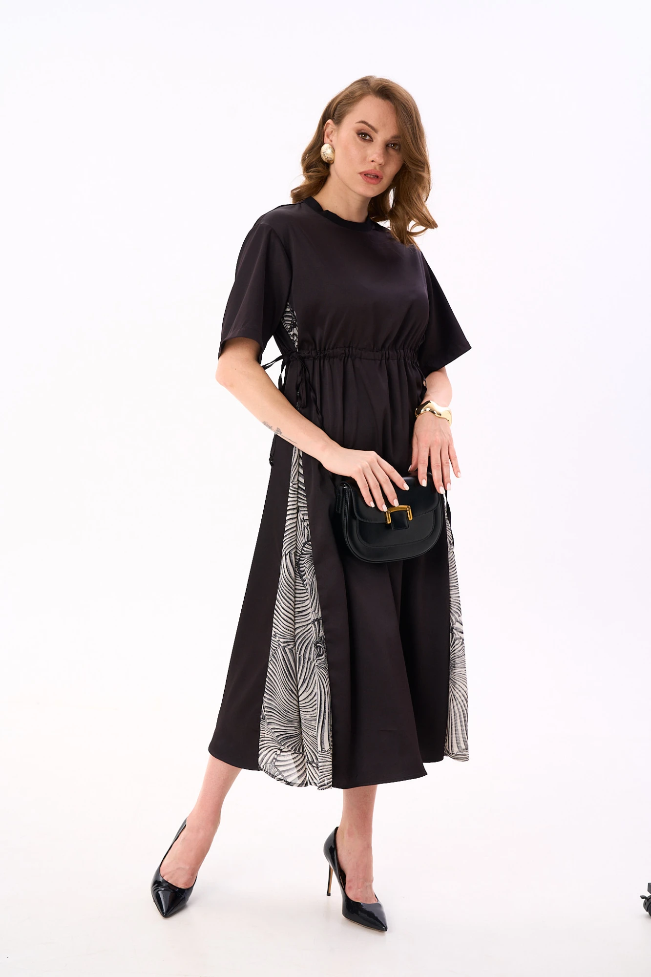 Платье длиной миди комбинированное, свободного кроя, расклешенное к низу. Перед состоит из центральной и боковой части. Спинка с притачной кокеткой, центральной и боковыми частями. На переде и спинке по линии талии настрочена кулиска, с регулировкой прилегания с помощью шнура. Рукав втачно одношовный короткий. Горловина изделия круглой формы.