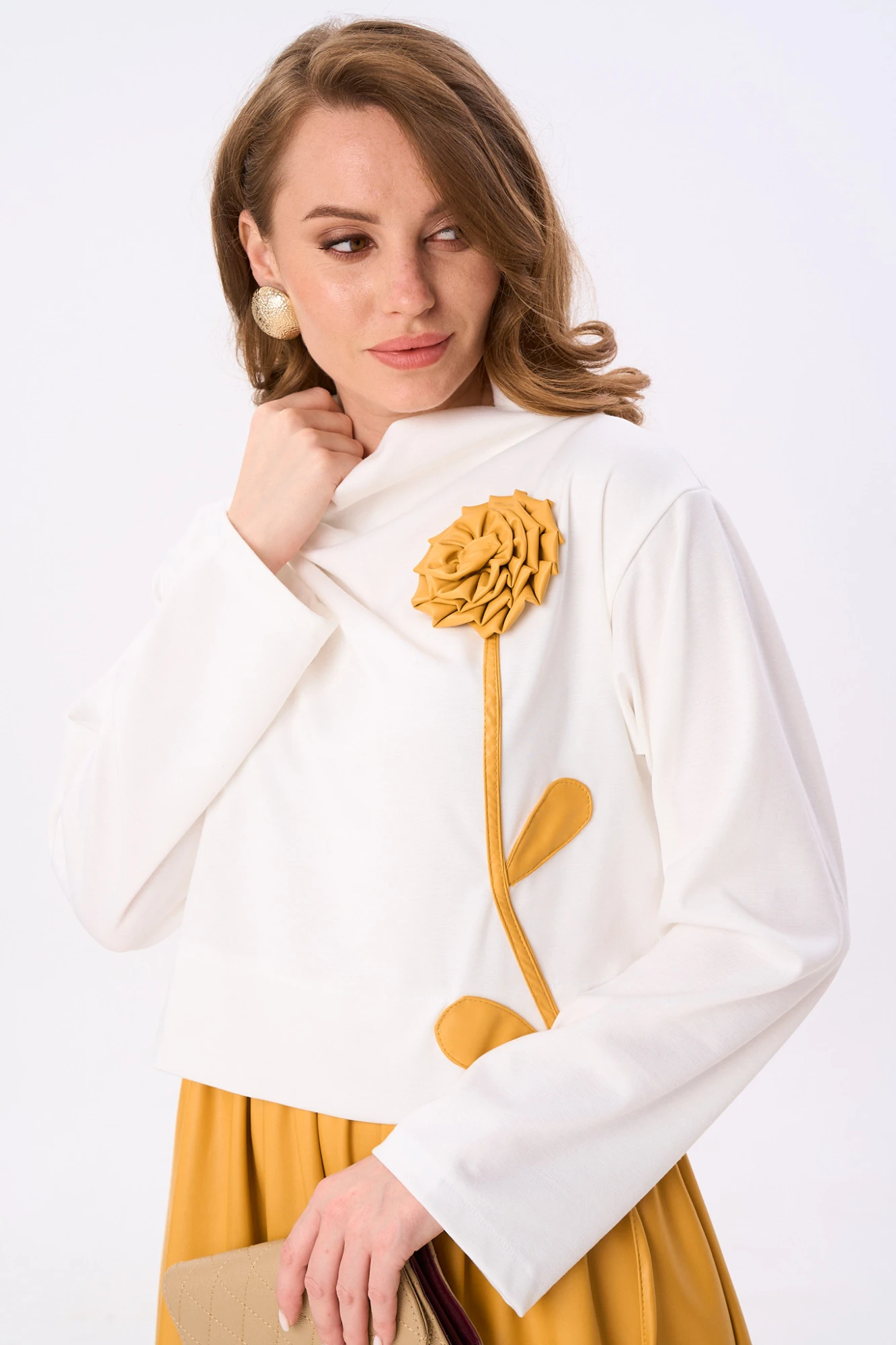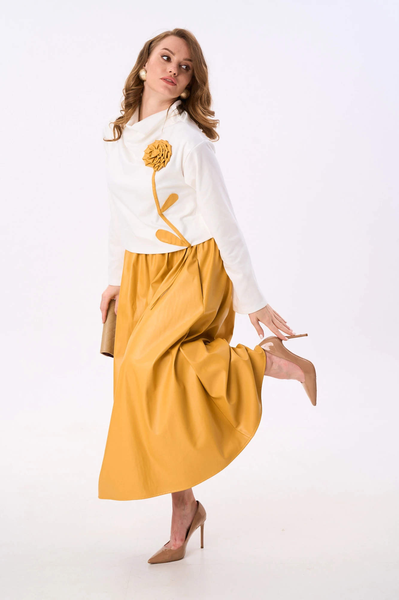 Платье прямого силуэта, состоящее из комбинации двух тканей - основной и отделочной. Воротник цельнокроеный хомут. Рукав одношовный, втачной, длинный. Нижняя юбка из отделочной ткани, со сборкой по линии талии. В виде отделки по левой части переда декоративный элемент из отделочной ткани.