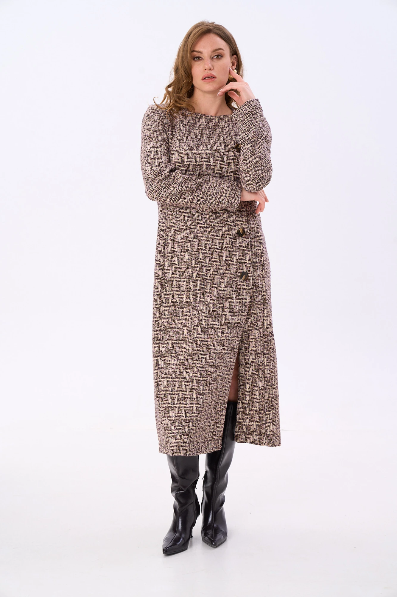 Платье длиной миди полуприлегающего силуэта.Застежка по переду бортовая, смещена в сторону левого бока, на петли и пуговицы. Перед с рельефами из проймы, с нагрудной вытачкой и карманом. Нагрудная вытачка из рельефного шва. Спинка с плечевой вытачкой из плечевого шва и рельефами из проймы. В среднем шве спинки шлица. Рукав втачной, двухшовный. Вырез горловины переда имеет квадратную форму.
