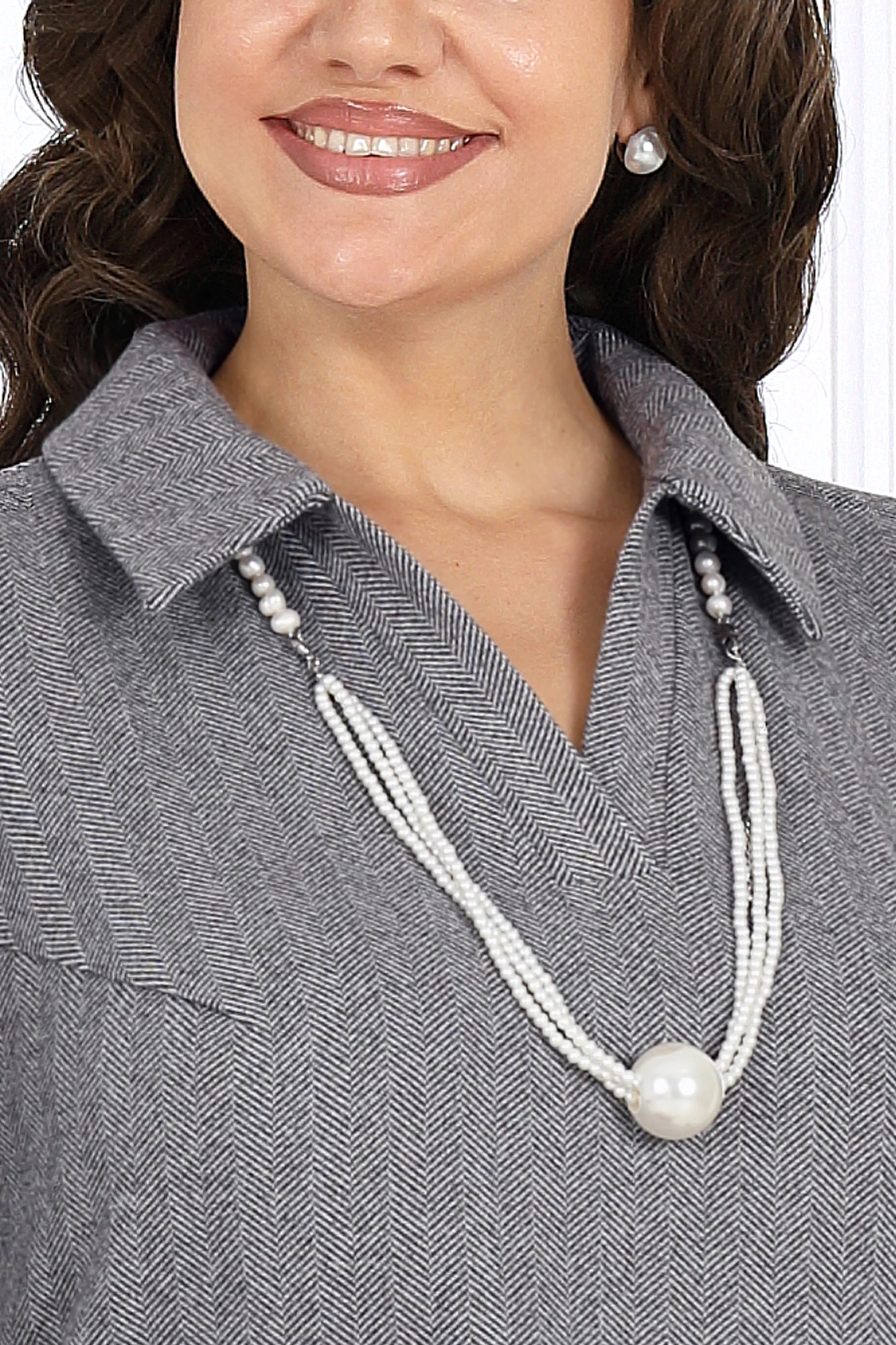 Платье женское, прямого силуэта, расширенное к низу, выполнено из трикотажного полотна. Платье женское прямого силуэта, длиной по среднему шву спинки 124 см, от шва втачивания воротника. Перед платья с нагрудными вытачками из проймы. Спинка со средним швом. В боковых швах обработаны карманы и разрезы. Воротник рубашечного типа, по переду планка «поло». Рукав втачной, одношовный, длиной 60 см. Платье без подкладки.
