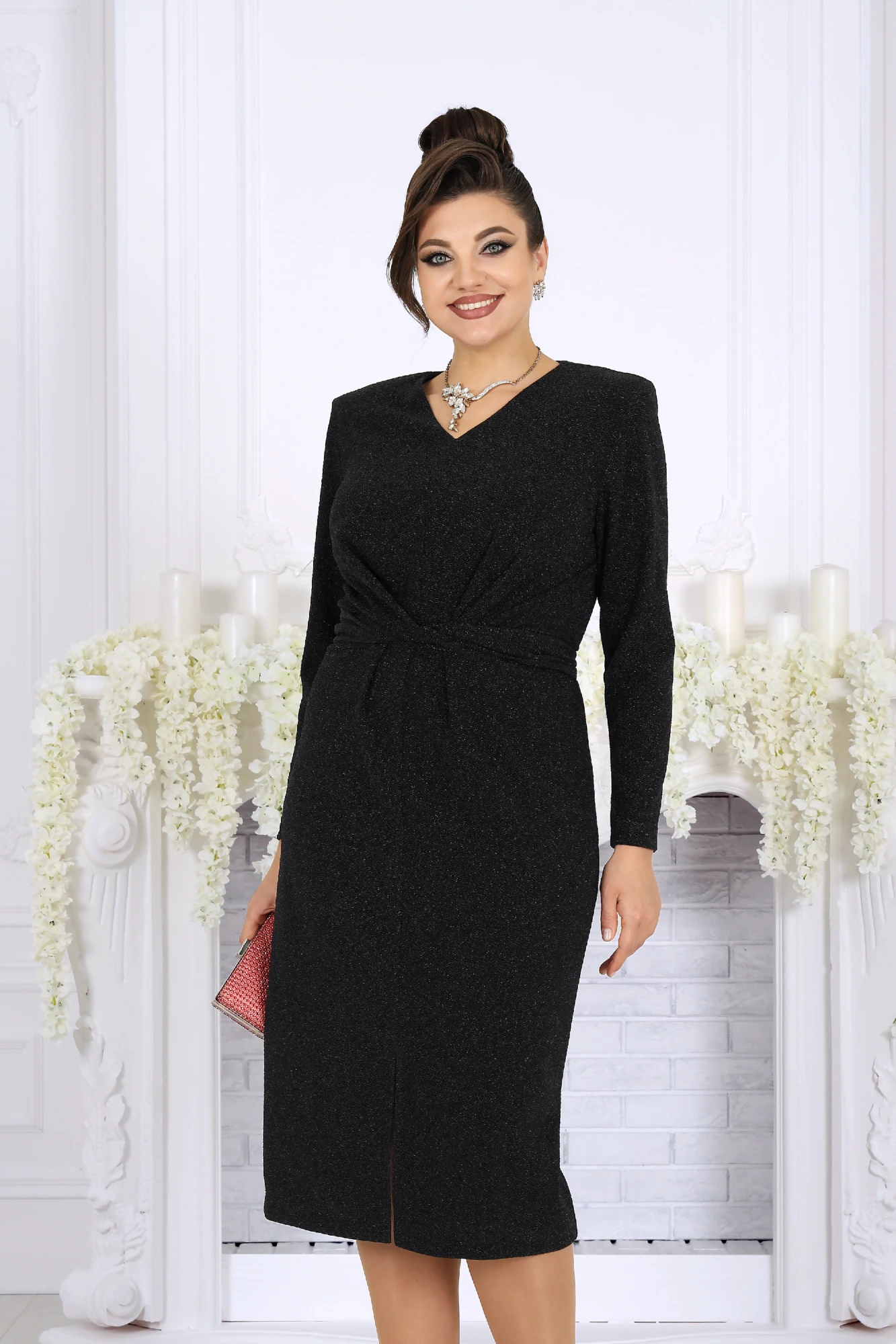 Материал — трикотаж с фактурной лицевой стороной люрекс — отличается качеством и мягкостью, хорошо ложится по фигуре, подстраиваясь под формы, а подкладка обеспечивает комфорт. Благодаря продуманному крою, платье подходит для больших размеров и женщин с формами: подчёркивает достоинства, скрывает мелкие нюансы, делая силуэт стройным и элегантным.