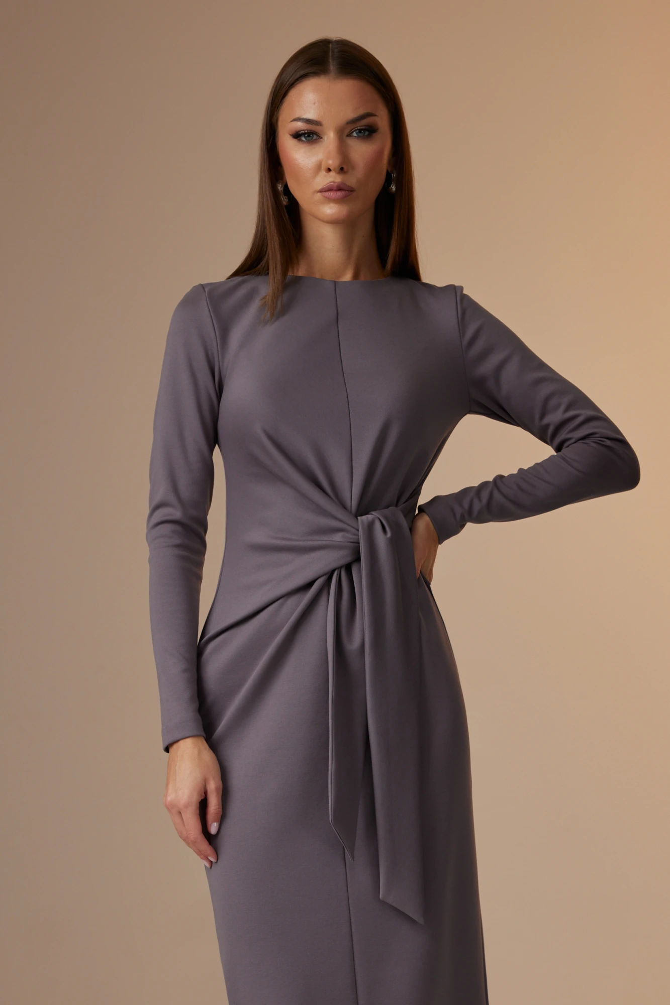 Платье женское, полуприлегающего силуэта. Перед со средним швом и драпировкой в области талии, переходящей в завязывающийся пояс. Горловина округлой формы. Спинка со средним швом, сверху заканчивается разрезом и застежкой на навесную петлю и пуговицу, снизу разрез. Рукав втачной, длинный, зауженный книзу.