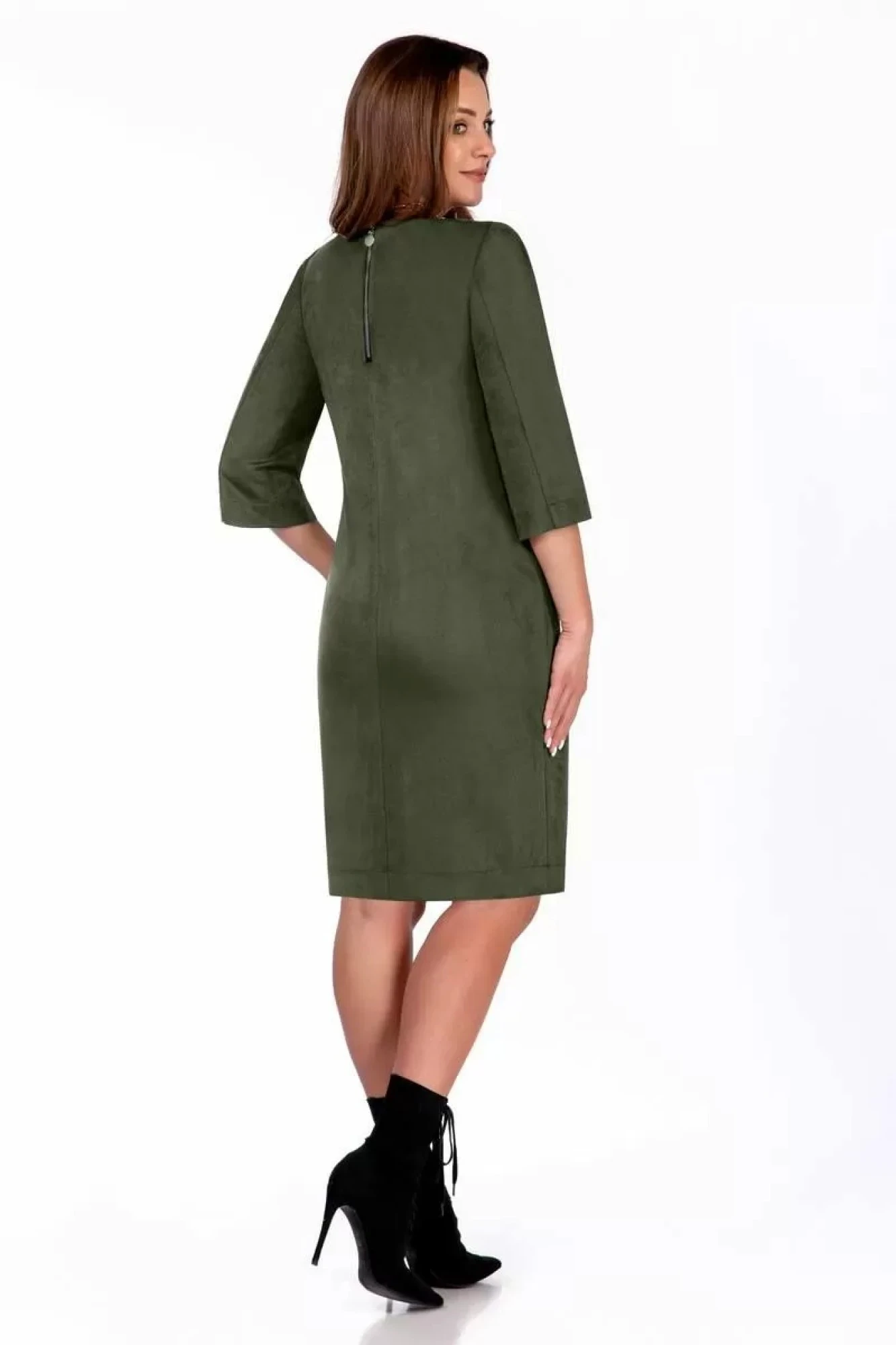 Платье женское, из трикотажной ткани, (не замша) полуприлегающего силуэта, с втачными рукавами. Деталь переда платья с нагрудными вытачками. Деталь спинки платья со средним швом, вверху шва застежка на декоративную тесьму-молнию. Рукава втачные, двухшовные, длиной 3/4, с передним и локтевым швами. Передние швы рукавов заканчиваются разрезами, с декоративной металлической фурнитурой. Вырез горловины округлой формы, обработан обтачкой.