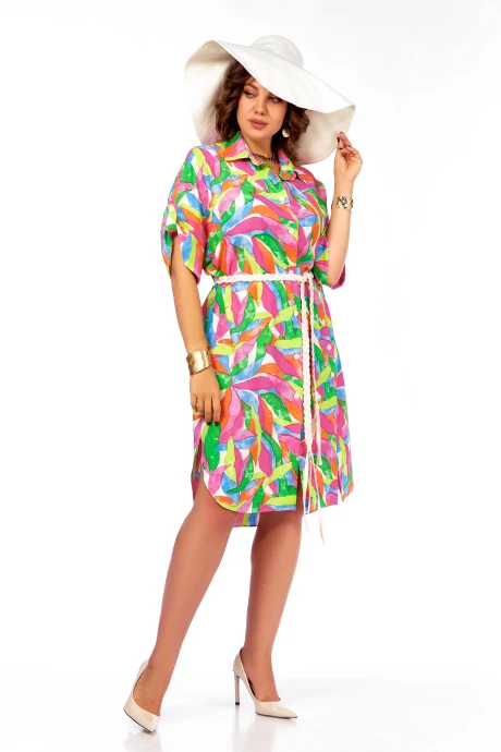 Платье свободного силуэта, с рубашечным воротником, платье по переду с застежкой на петли и пуговицы. Спущенная линия плеча, рукав свободный, короткий, с патой. По талии по спинке кулиска, в который продет плетеный пояс. Отрезная кокетка по спинке. Слева от талии шлица с застежкой на пуговицы. Линия низа фигурной формы.
