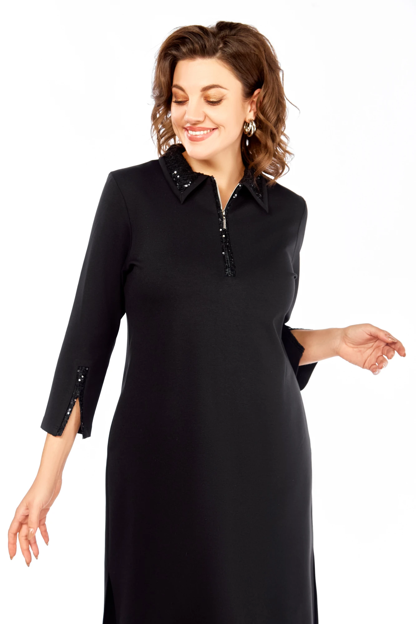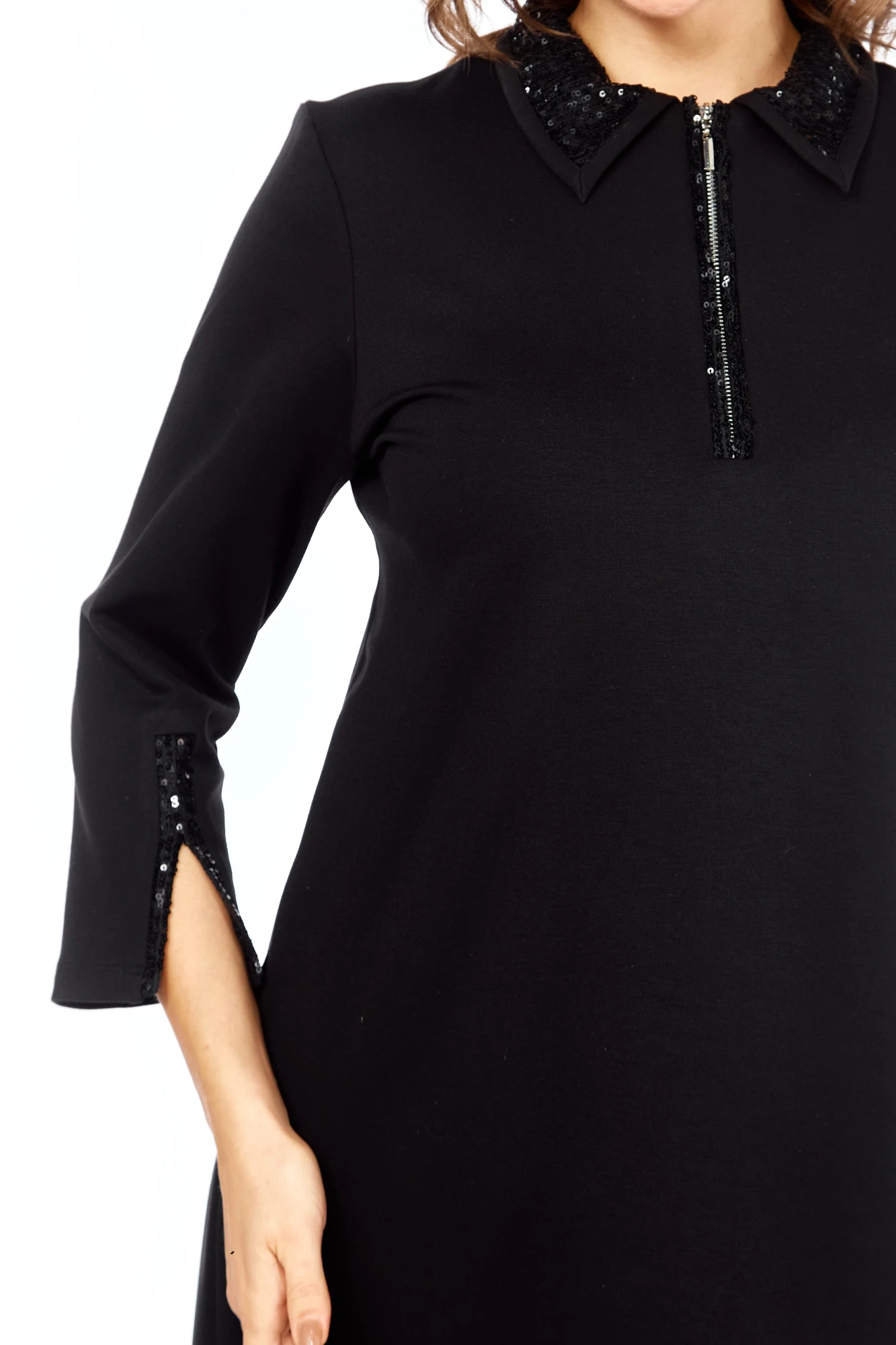 Интересное плать из премиального трикотажного полотна, с воротником поло и застежкой-молнией по центру. Контрастная отделка, А-силуэт, разрезы в боковых швах. Рукав втачной с контрастной отделкой-планкой по низу.