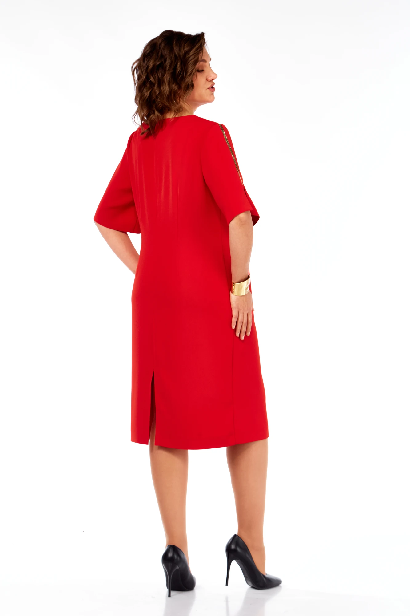 Очень интересное нарядное платье, полуприлегающего силуэта. Полочка украшена втачной тесьмой в золотом цвете, по центру до подреза. По спинке средний шов, потайная молния и разрез. Рукав втачной, длиной ниже линии локтя, по центру втачная декоративная тесьма.