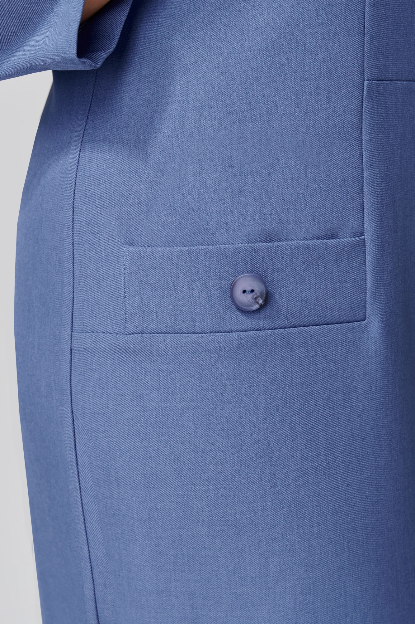 Платье женское полуприлегающего силуэта, втачного покроя с имитацией застежки по переду до подрезной линии, в бочках расположены листочки. Горловина округлой формы, рукава ¾ длины, двушовные. Спинка со средним швом, в котором расположена тесьма «молния» и шлица, а так же талиевые вертикально направленные вытачки. Платье выполнено из однотонной ткани костюмно-плательной группы.