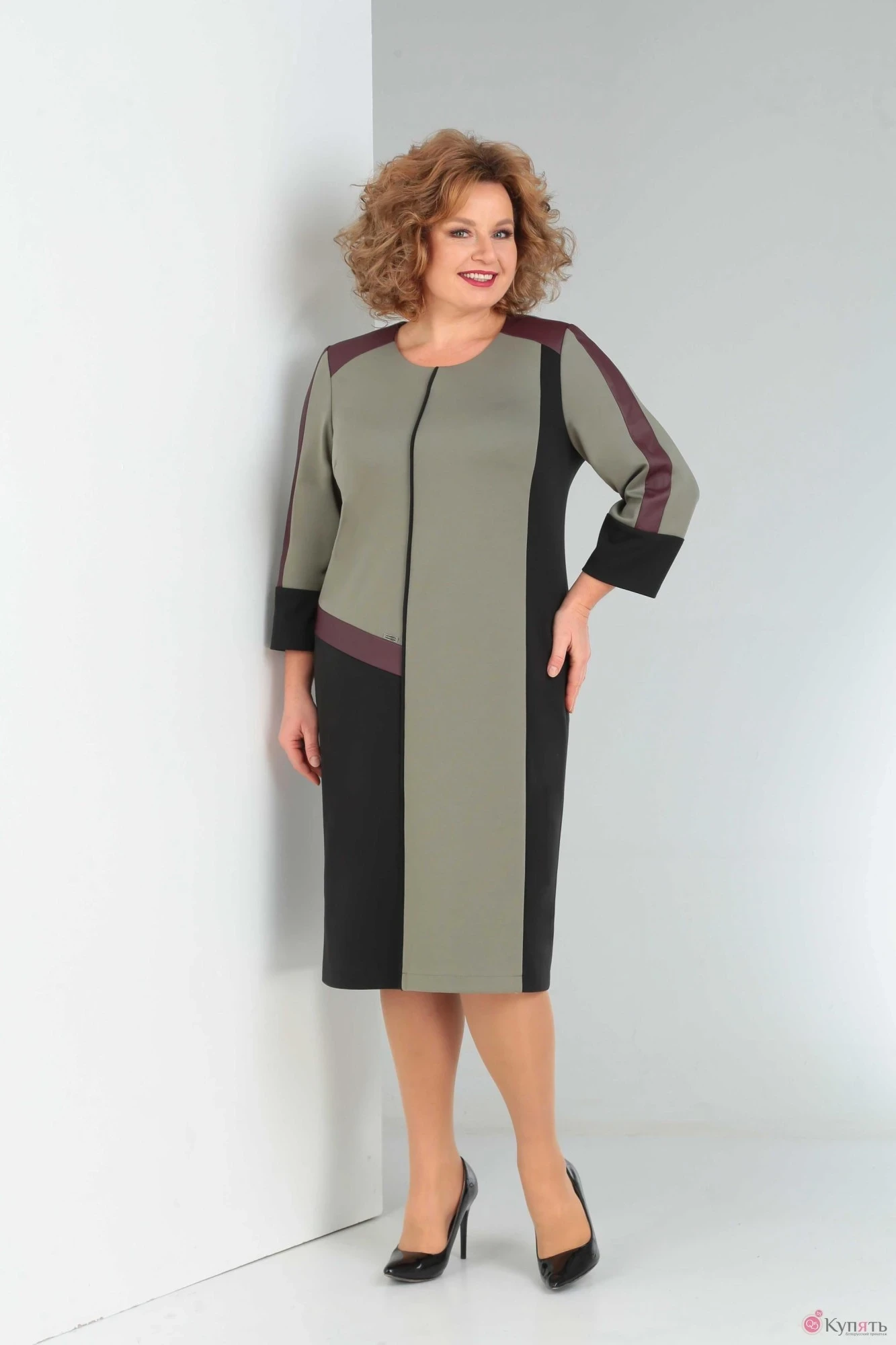 Платье из трикотажа. Платье скомбинировано из 2-х цветов трикотажа (олива и черный) и трикотажной ткани под кожу бордового цвета. Линии платья выгодно подчеркивают стройность фигуры, а подобранная цветовая гамма делает платье стильным и современным. Горловина округлой формы. Силуэт платья прямой. На спинке центральный шов переходит в шлицу. Рукав двушовный.