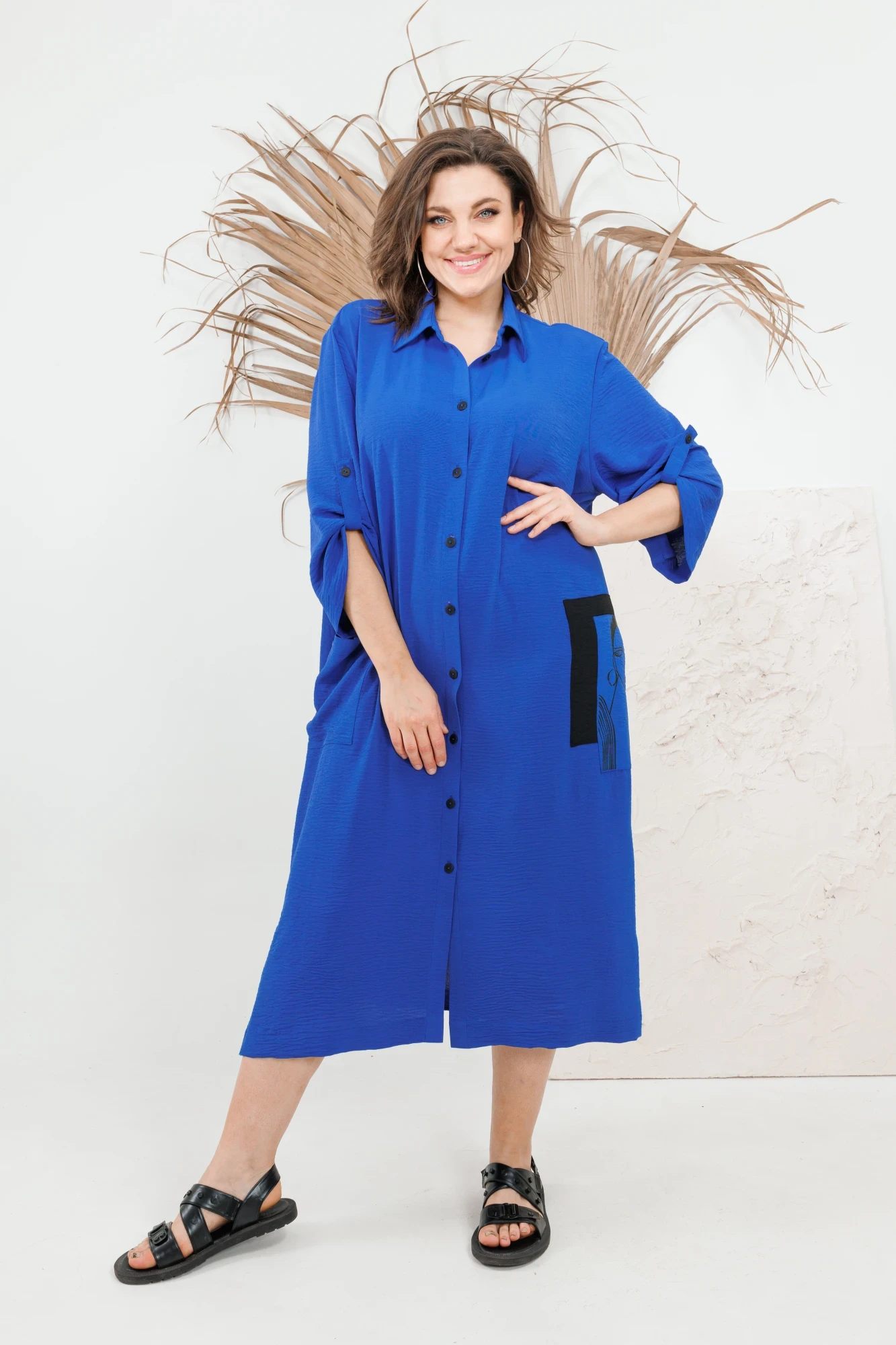 Свободное женское платье рубашечного кроя. Стильное платье-рубашка вытягивает силуэт и создает актуальный образ. Платье длины макси с центральной сквозной застежкой на петли и пуговицы, с сорочечным воротником, с длинными рукавами на пате. На правой полочке платья - функциональный карман, на левой- имитация кармана с авторской декоративной печатью. По спинке кокетка, по бокам платья - разрезы. Можно носить как: платье красивое, платье нарядное, платье большого размера, платье бохо, платье в офис, платье для беременной, платье оверсайз, платье офисное, платье свободное, платье стильное. Идеальная яркая одежда впишется в гардероб тех, кто любит подчеркнуть индивидуальность.