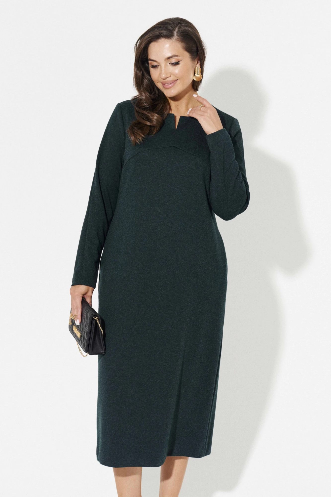 Если вам нужен универсальный вариант наряда, выбирайте трикотажное платье миди. Выполнено платье женское в прямом крое, поэтому визуально отлично скрывает погрешности фигуры. Прямое платье с длинным рукавом подойдет для прохладного лета, ранее осени и поздней весны. В лаконичном стиле изделия кроется его красота. Круглая горловина изделия имеет небольшой вертикальный разрез, который подчеркивает пышную линию декольте. Заказывайте женское платье больших размеров от 50-58. Сочетайте его с различной обувью и аксессуарами, создавая нарядные или стандартные образы.