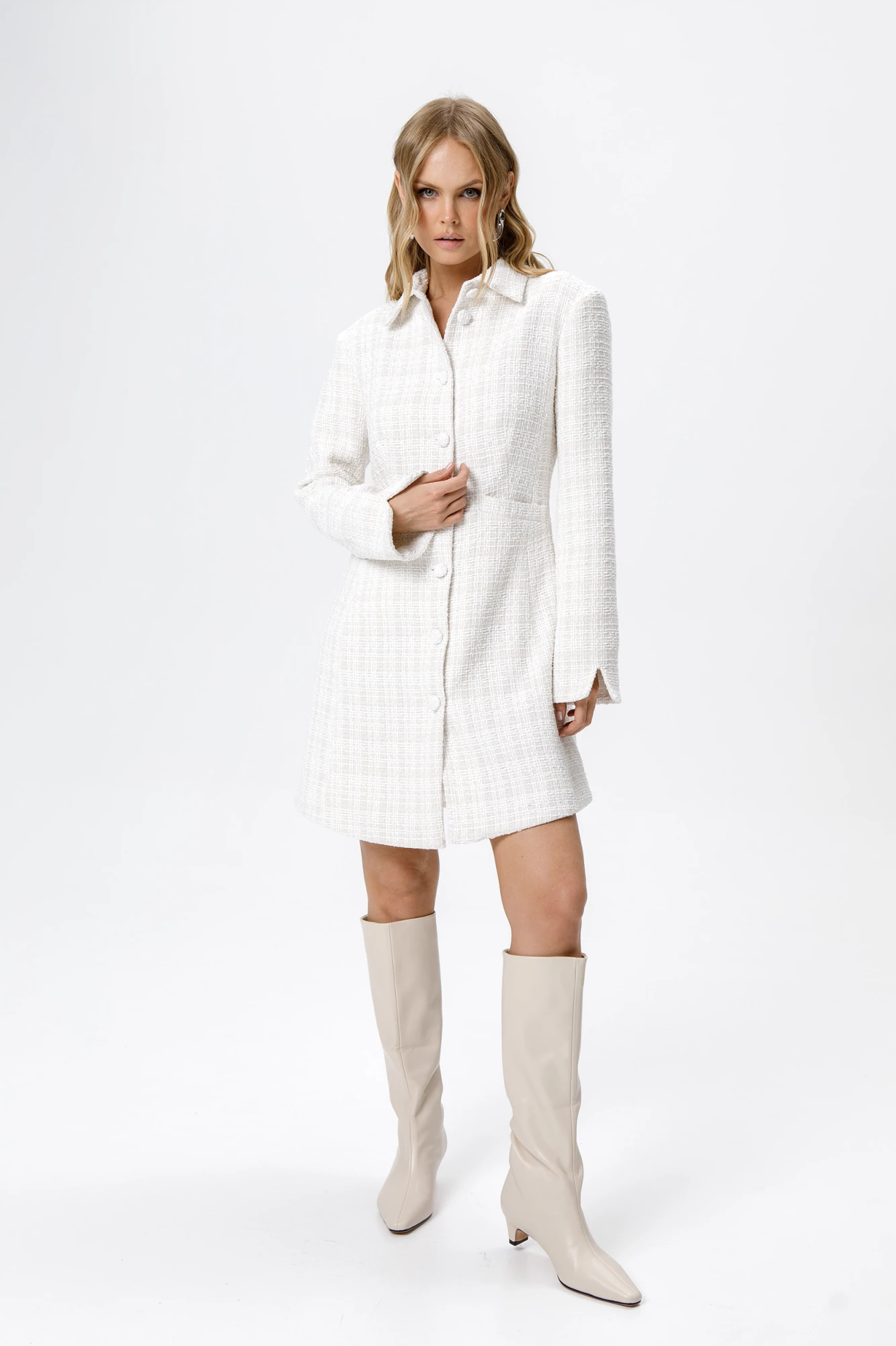 Приталенное платье из фактурной ткани.