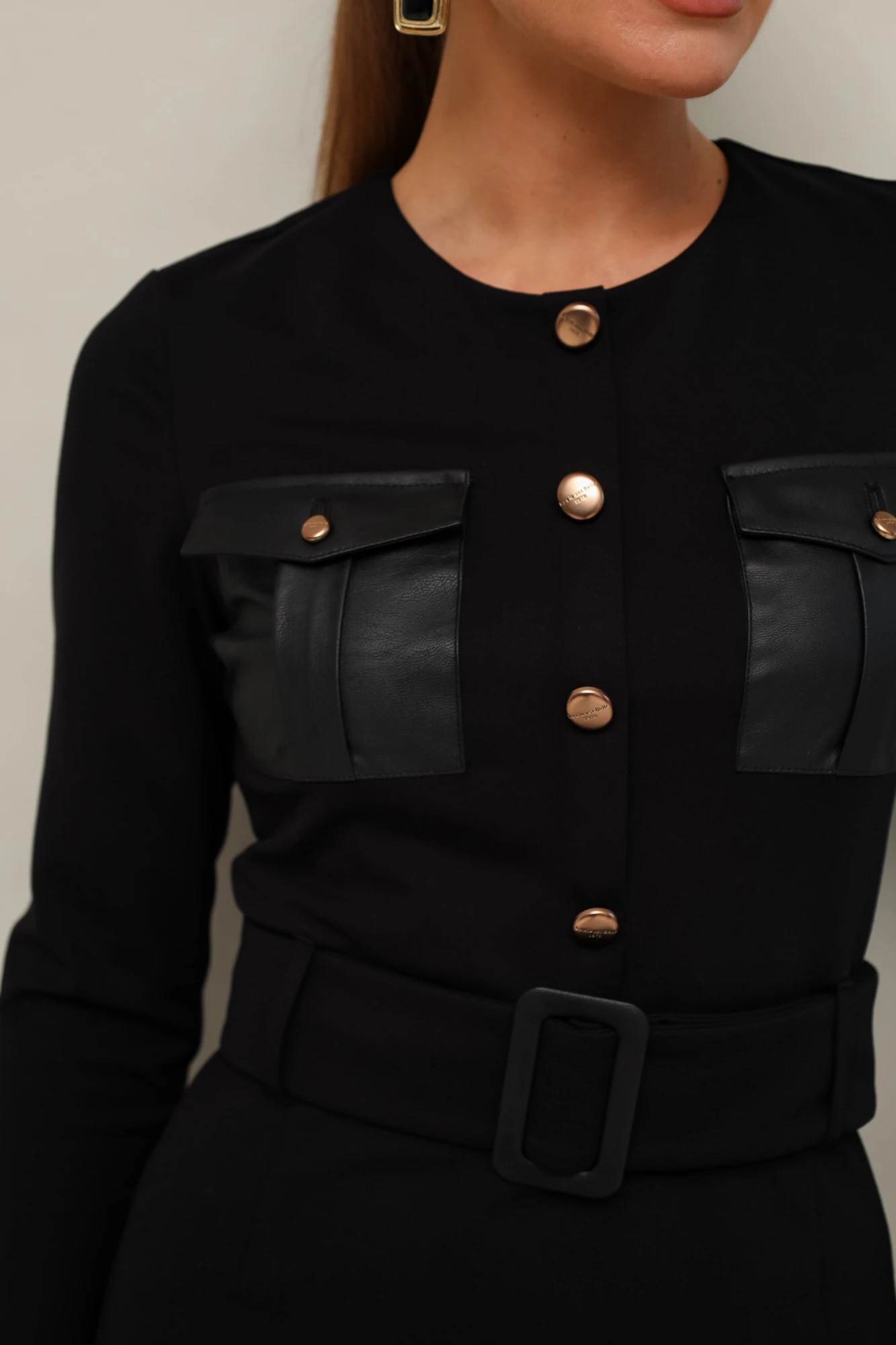 Горловина округлой формы. По лифу обработана планка с пуговицами и нагрудные накладные карманы с клапанами. Длинные втачные рукава. Спинка с застежкой на потайную молнию в среднем шве. Для удобства движения сзади обработан разрез.