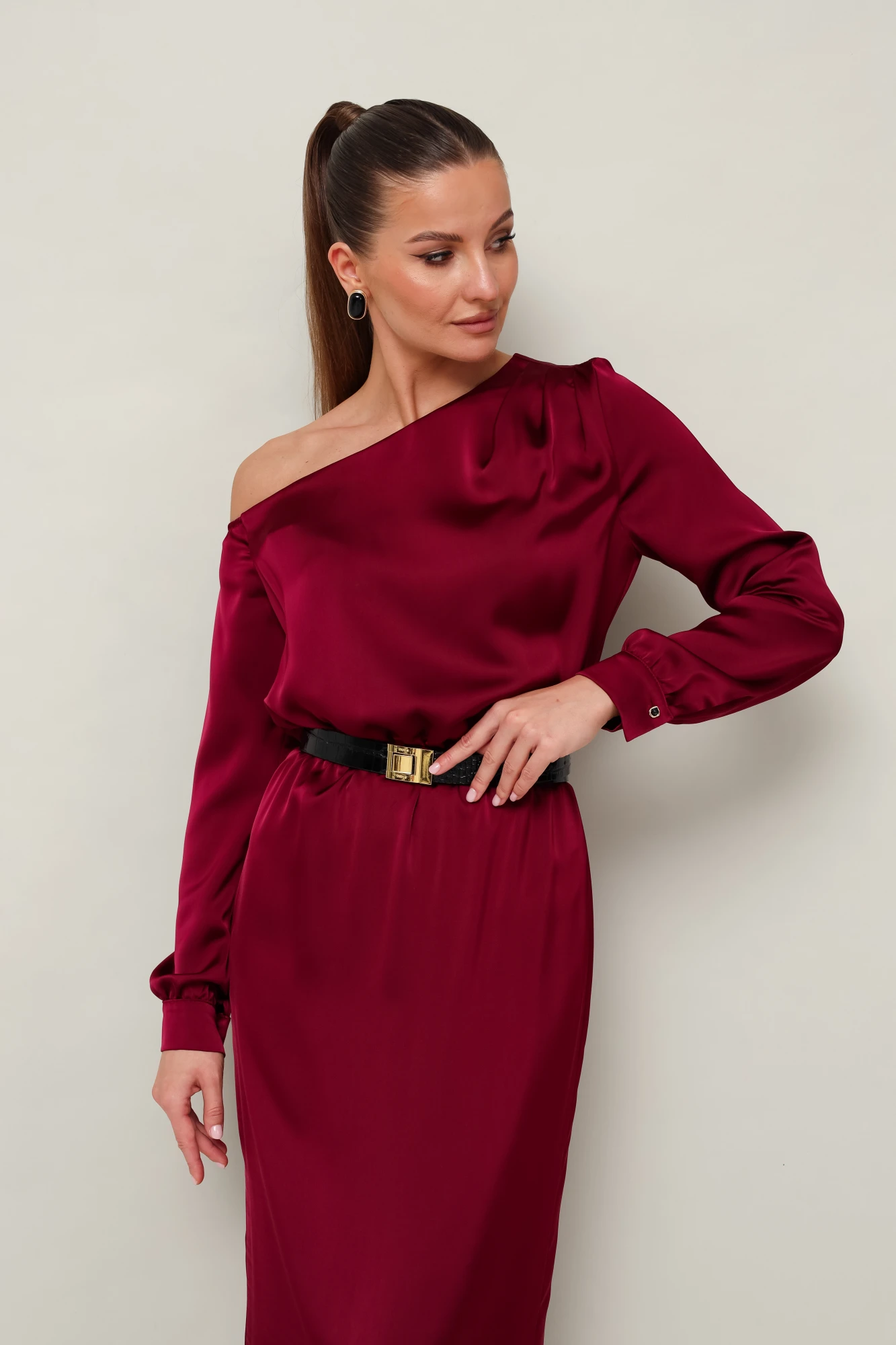 "Вечернее платье полуприлегающего силуэта, выполнено из струящейся ткани с благородным матовым блеском. Ассиметричный вырез горловины с открытым плечом. Правый плечевой шов декорирован складками. Платье отрезное по линии талии на резинке. Рукава длиннные с манжетами с застежкой на петли и пуговицы. По спинке в среднем шве юбки обработан разрез.