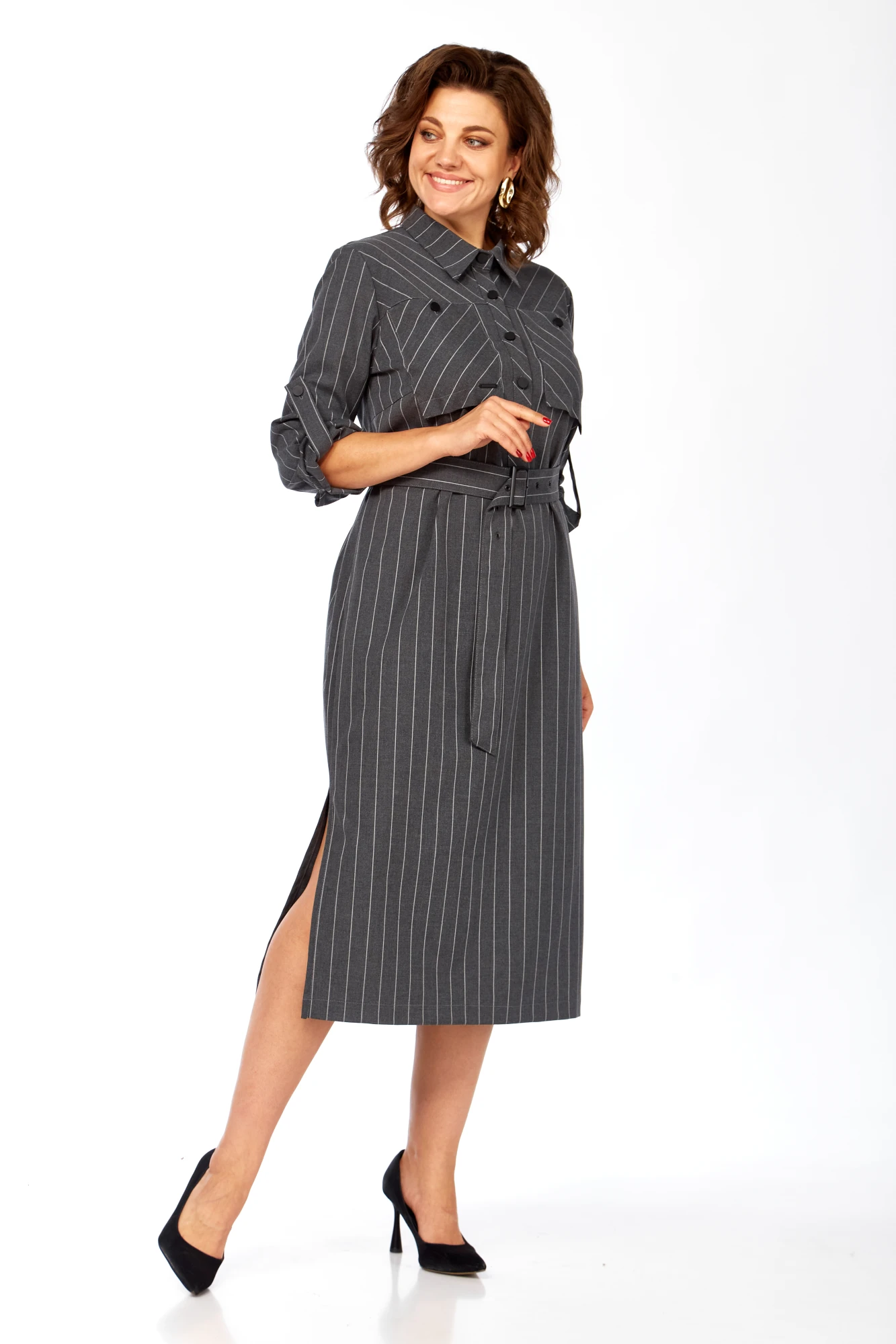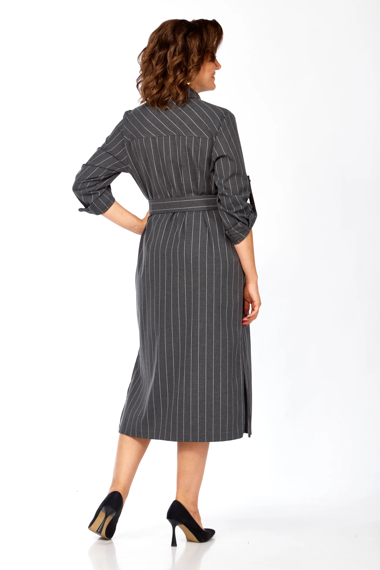 Модное платье-рубашка из плательно-костюмной ткани в изысканную полоску — идеальное сочетание шика и современности. Универсальная длина и разрезы по боковым швам придают образу лёгкость и динамику, а пояс выгодно подчёркивает линию талии, создавая женственный силуэт.