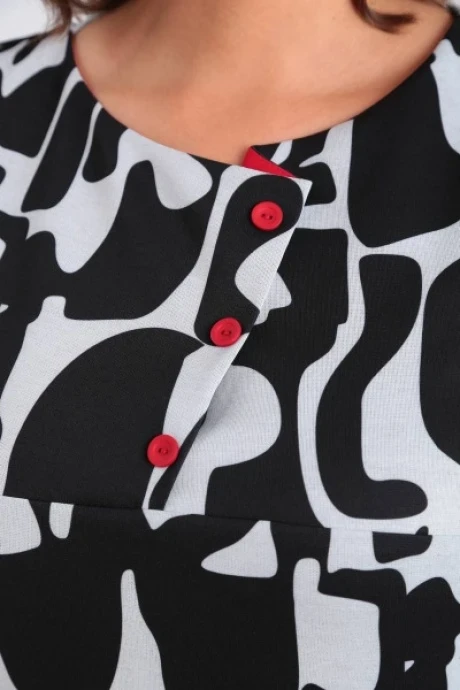 Платье полуприлегающего силуэта, разрезное по линии груди, с округлой горловиной и декоративной складской по центру оформлено пуговицами. Спинка со средним швом по низу ш лица, таливые выточки. В боковых швах потайные карманы. Рукав одношовный прямой обтачкой в цвет декора, зафиксированный пуговицей.