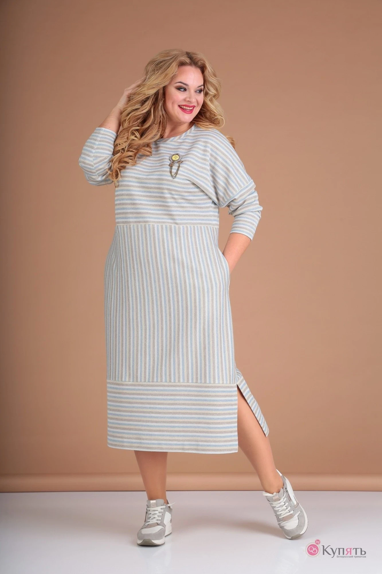 Платье женское прямого силуэта со спущенным плечевым поясом и свободного кроя рукавом изготовлено из эластичного трикотажного полотна с натуральными х/б волокнами и вкраплением мягкой нити с легким мерцающим эффектом. Горловина округлой формы обработана притачной планкой. В боковых швах функциональные карманы. По низу в боковых швах разрезы. К платью прилагается оригинальная съемная брошь.