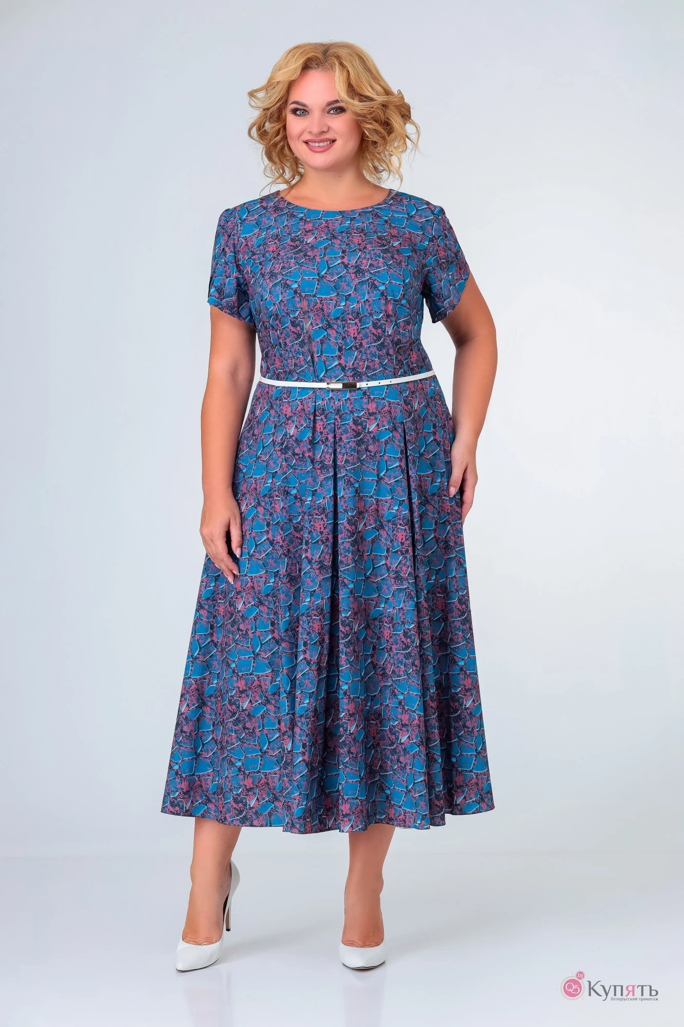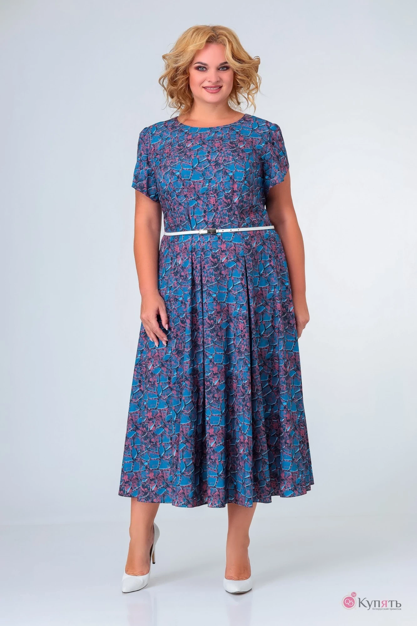 Платье из тонкого текстиля прилегающего силуэта. По переду и спинке лифа расположены рельефы. Юбка расклешенная из шести клиньев со встречными складками по линии талии. В среднем шве спинки предусмотрена молния. Рукав втачной покроя тюльпан, длина рукава 15 см (+ - 1 см) (в размере 54-64) и 33 см (+ - 1 см) (в размере 66-70) В комплекте ремень с декоративной пряжкой.