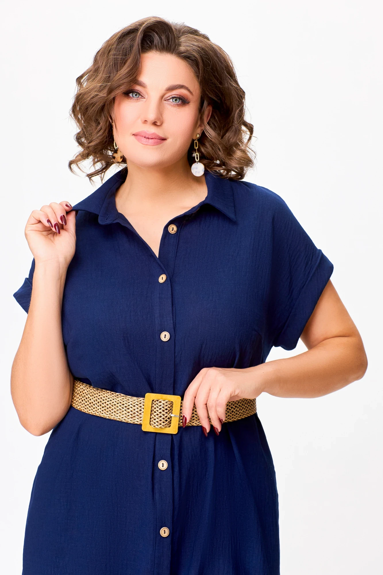 Платье-рубашка из льняной ткани с вискозой свободного кроя, расклешённое к низу. Застёжка центральная на петли и декоративные пуговицы, пройма спущенная с отложной манжетой. Спинка цельная. Воротник отложной со стойкой. В боковых швах предусмотрены карманы. По желанию подчеркнуть талию можно ремнём, идущим в комплекте.