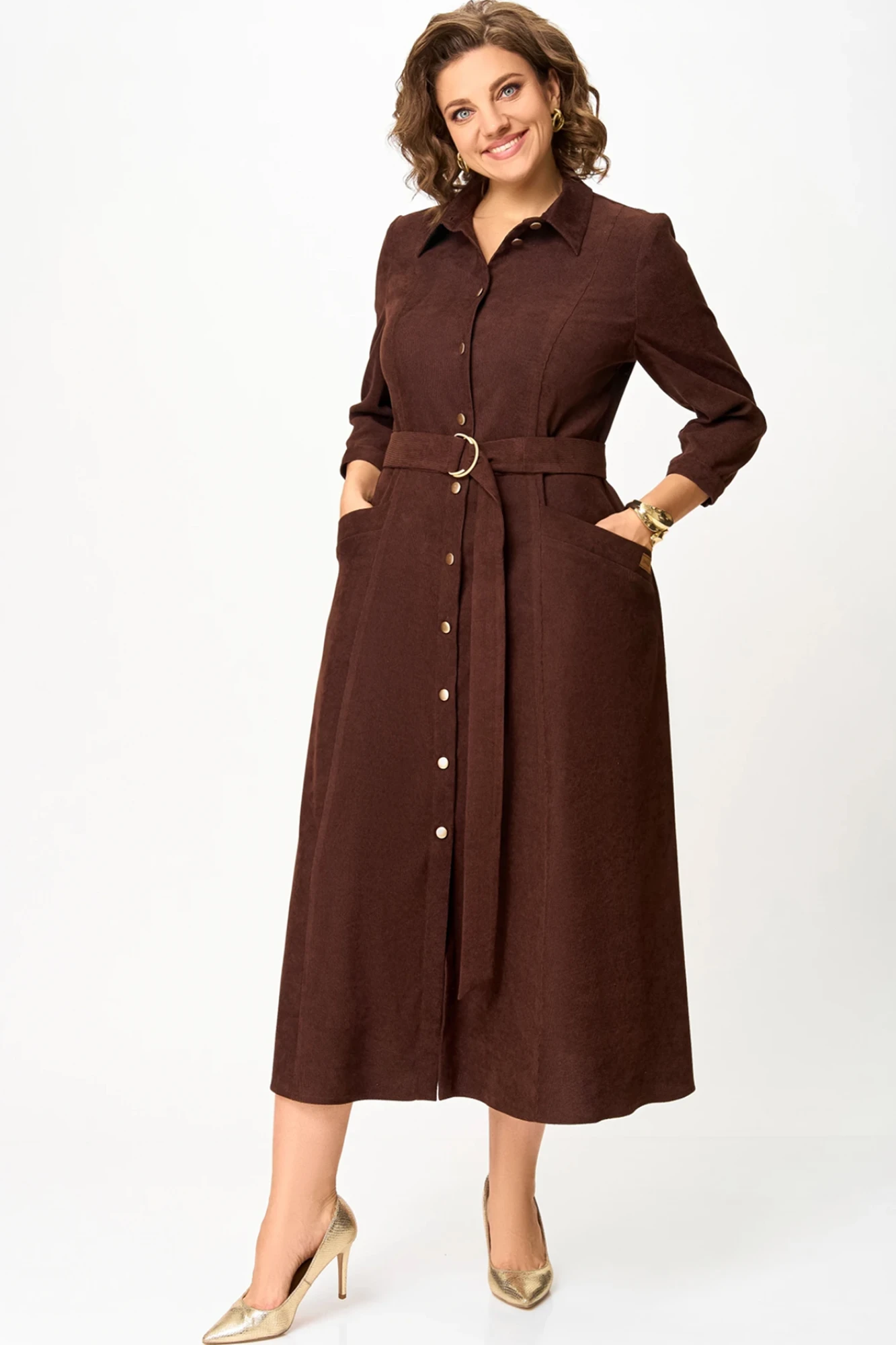Платье из мягкой ткани вельвет, отрезное по линии талии с полуприлегающим лифом и юбкой А-силуэта, с центральной застёжкой на петли и декоративные пуговицы.